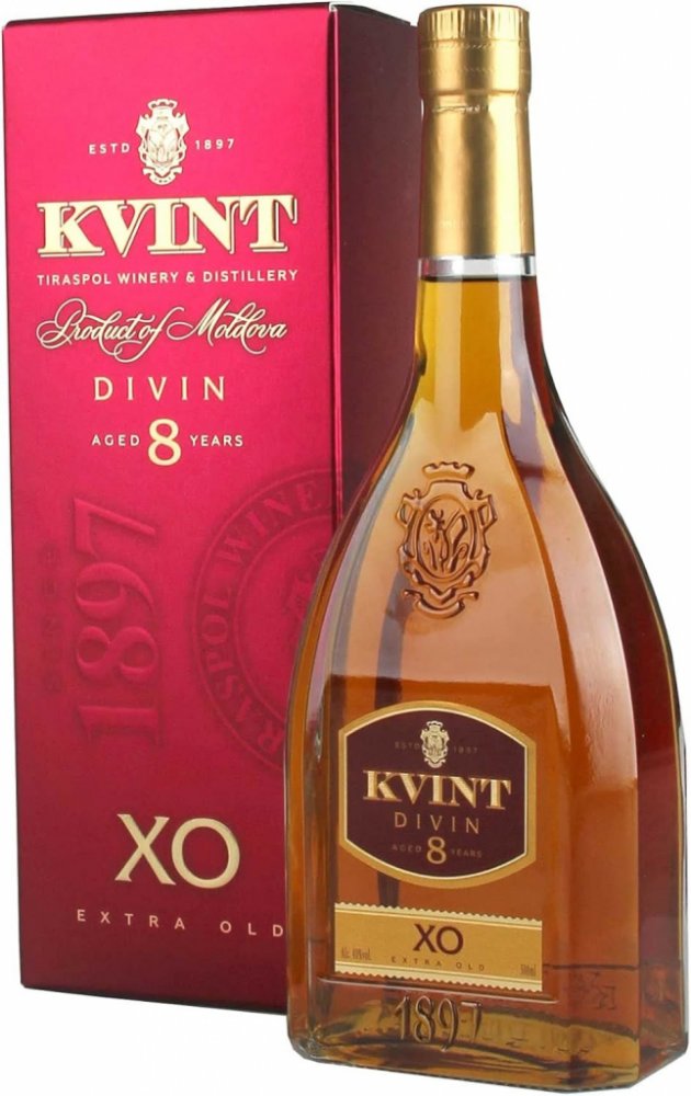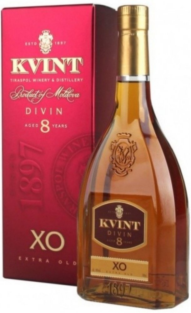 Kvint Divin XO má sytě jantarovou barvu. Ve vůni dominují květinové motivy. Má sametovou, vyváženou chuť s výraznými tóny sušených meruněk a ořechů. Zrál v dubových sudech dlouhých 8 let. Dodáváno v dárkové krabičce.
