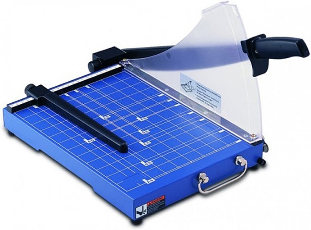 Výkonná páková řezačka s ručním přítlakem, kovovým stolem a plastovým ochranným krytem. Na stole jsou vyznačeny běžné DIN formáty, lišta s měřítkem a zadním dorazem. Délka řezu je 310 mm a maximální kapacita 20 listů (80g/m).