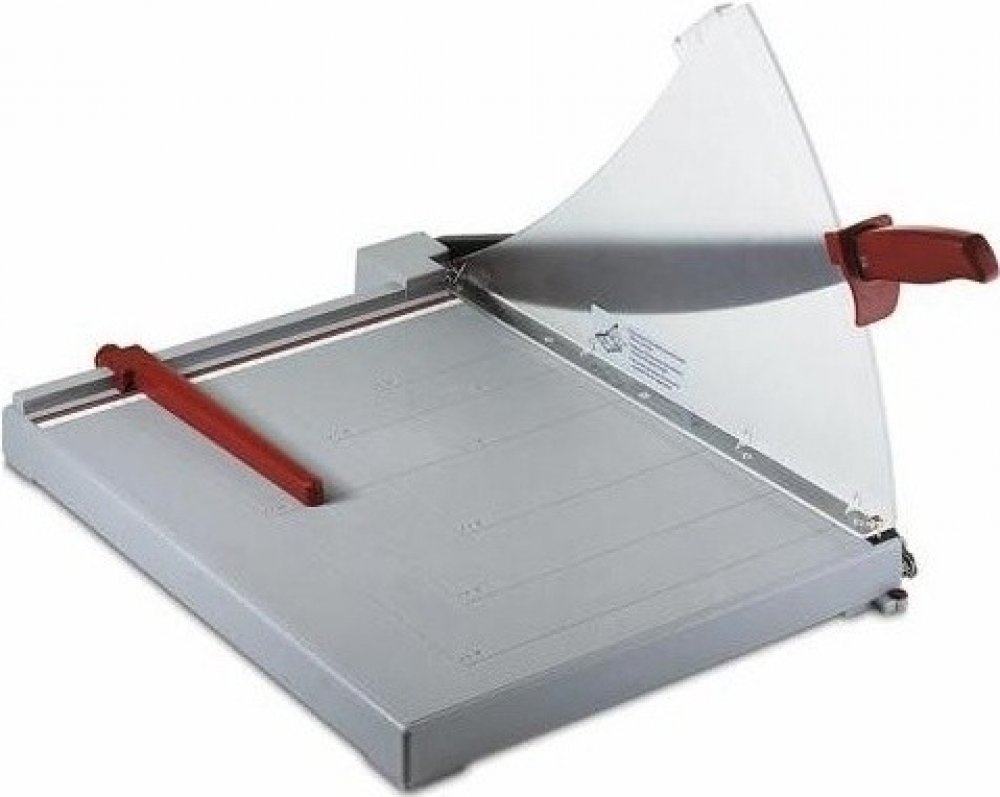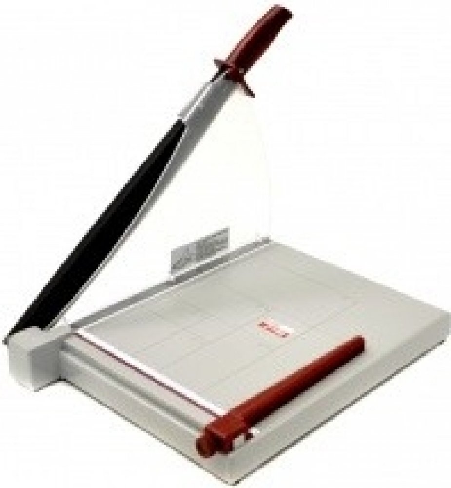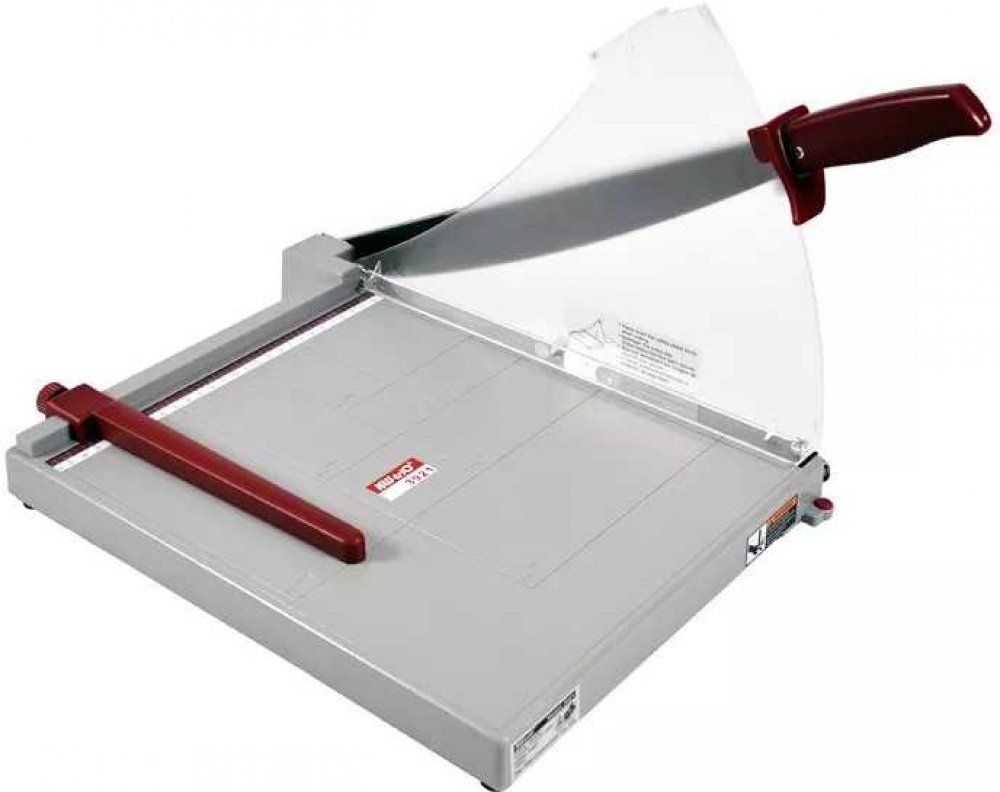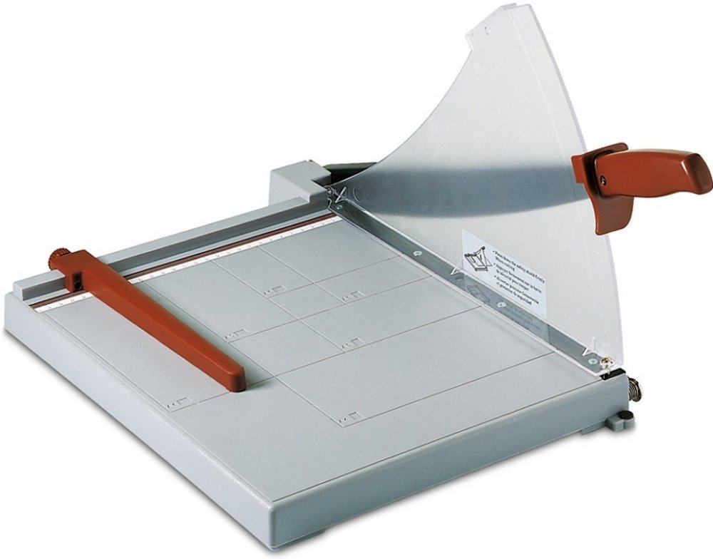 Hobby páková řezačka A4 s plastovým ochranným krytem a plastovým stolem s oděruvzdorným povrchem ABS, s vyznačenými měřítky a DIN formáty a posuvným dorazem papíru se šroubovou aretací.