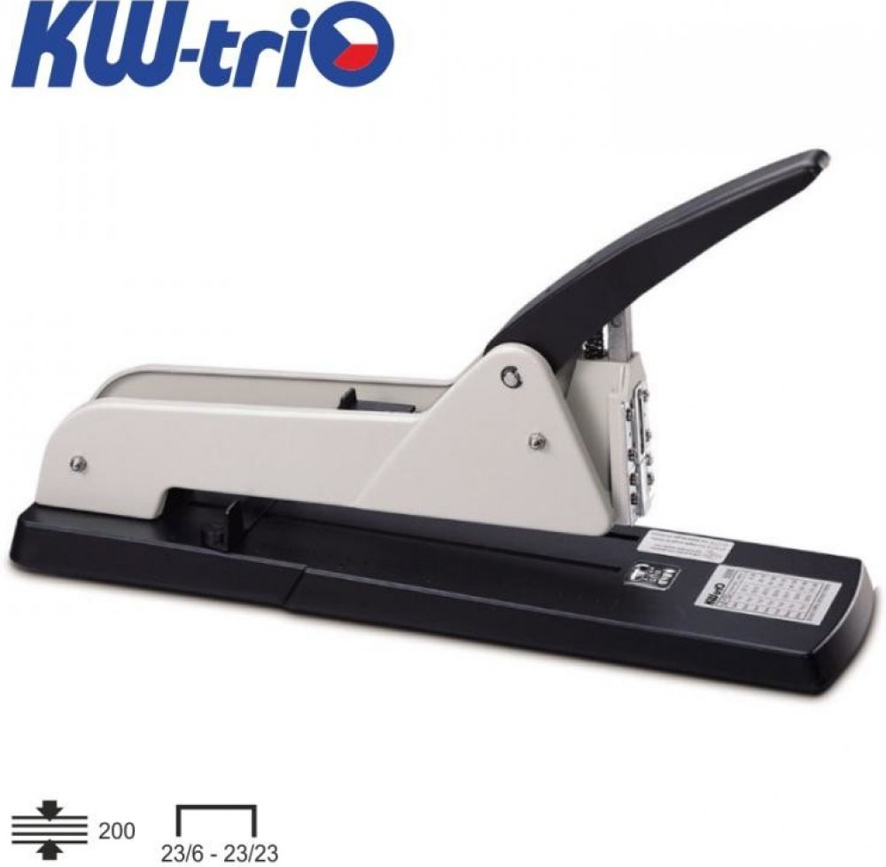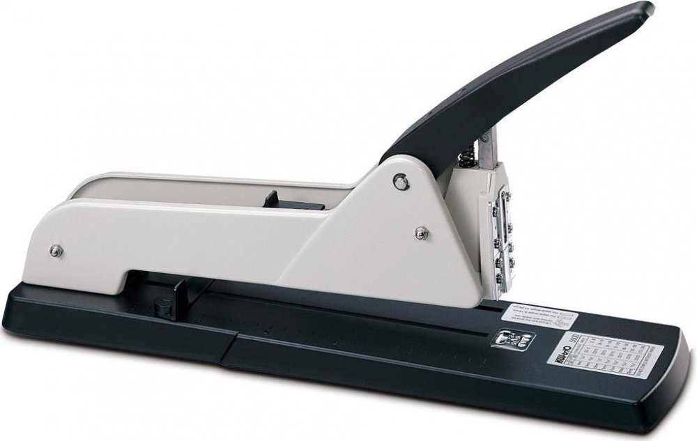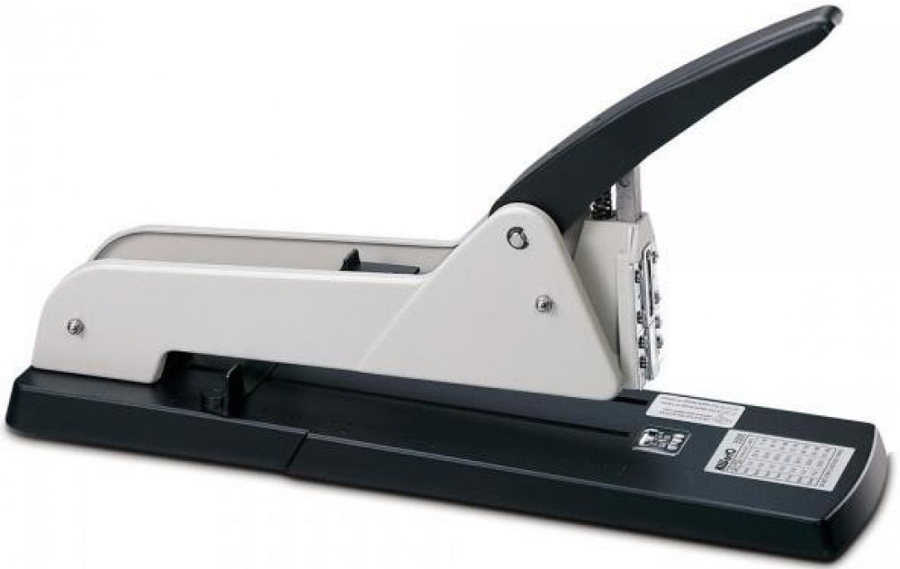 Výkonná bloková sešívačka s kapacitou až 200 listů s ramenem dlouhým 25 cm schopným sešít A3 uprostřed.