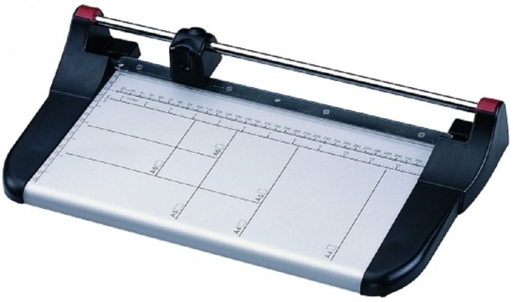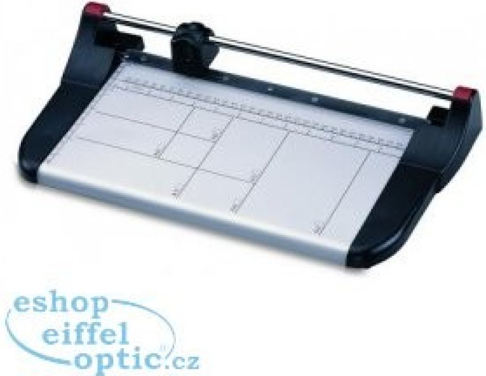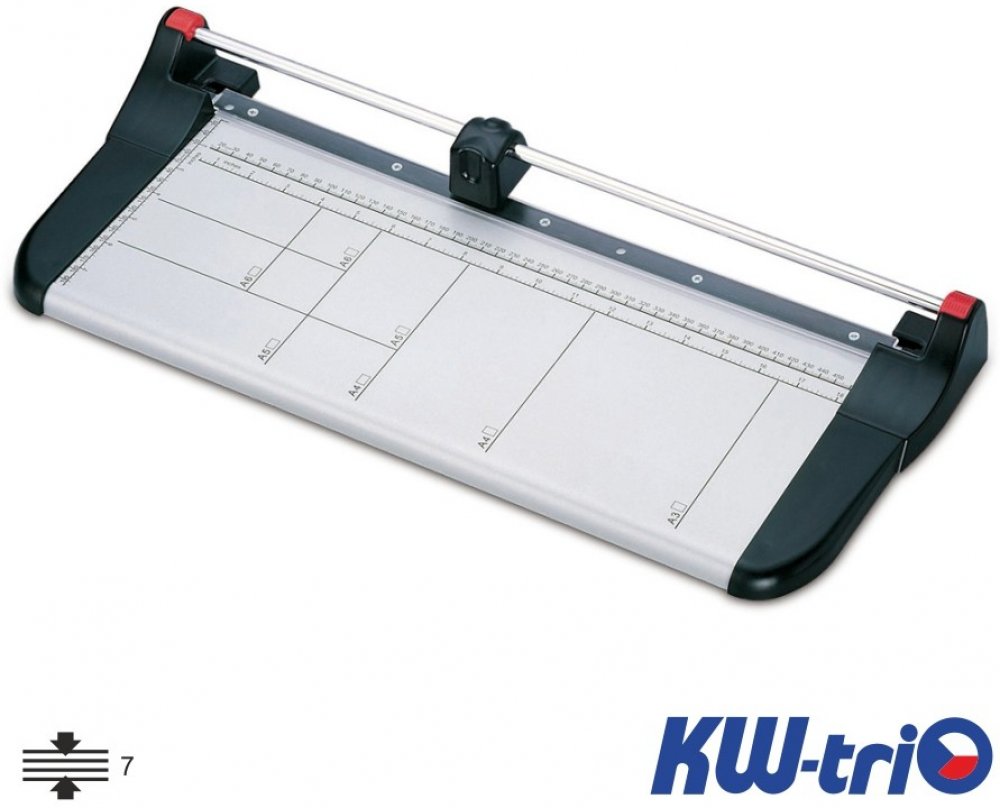 Kvalitní kolečková řezačka KW-triO kW eco 33 s pevnou kovovou základnou a řeznou hlavou umístěnou na kovové tyči, určena pro formát A4. Pracovní stůl je vybaven natištěnými měřítky a přítlačnou lištou z průhledného plastu.