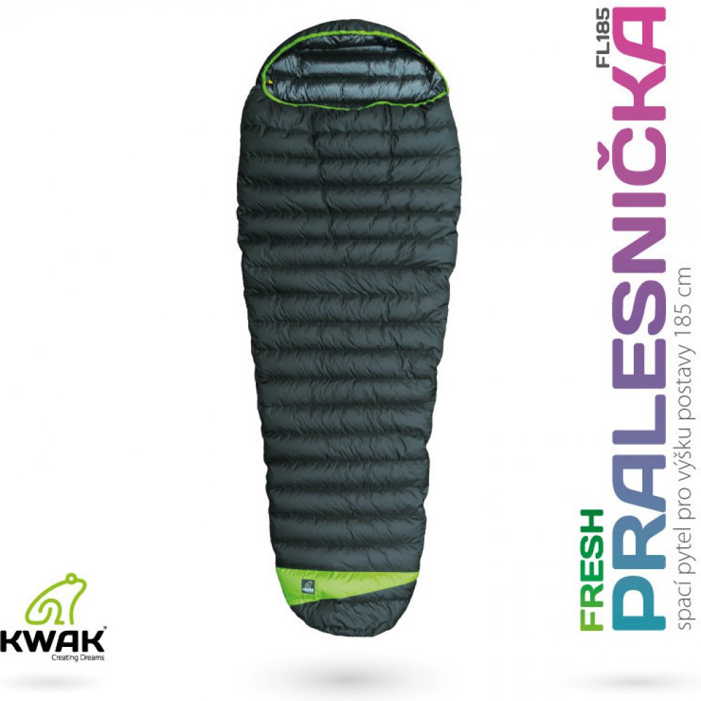 KWAK Spací pytel Fresh Pralesnička FL185 je lehčí varianta třísezónního spacího pytle. Propracovaný anatomický střih se zipem ve tvaru „I“ a komorami ve tvaru „H“ kopíruje siluetu těla. Nechybí 3D nastavitelný límec, vnější a vnitřní krycí léga a ani vnitřní kapsa na osobní věci. Kapuce se stahuje pomocí gumičky s brzdičkou.