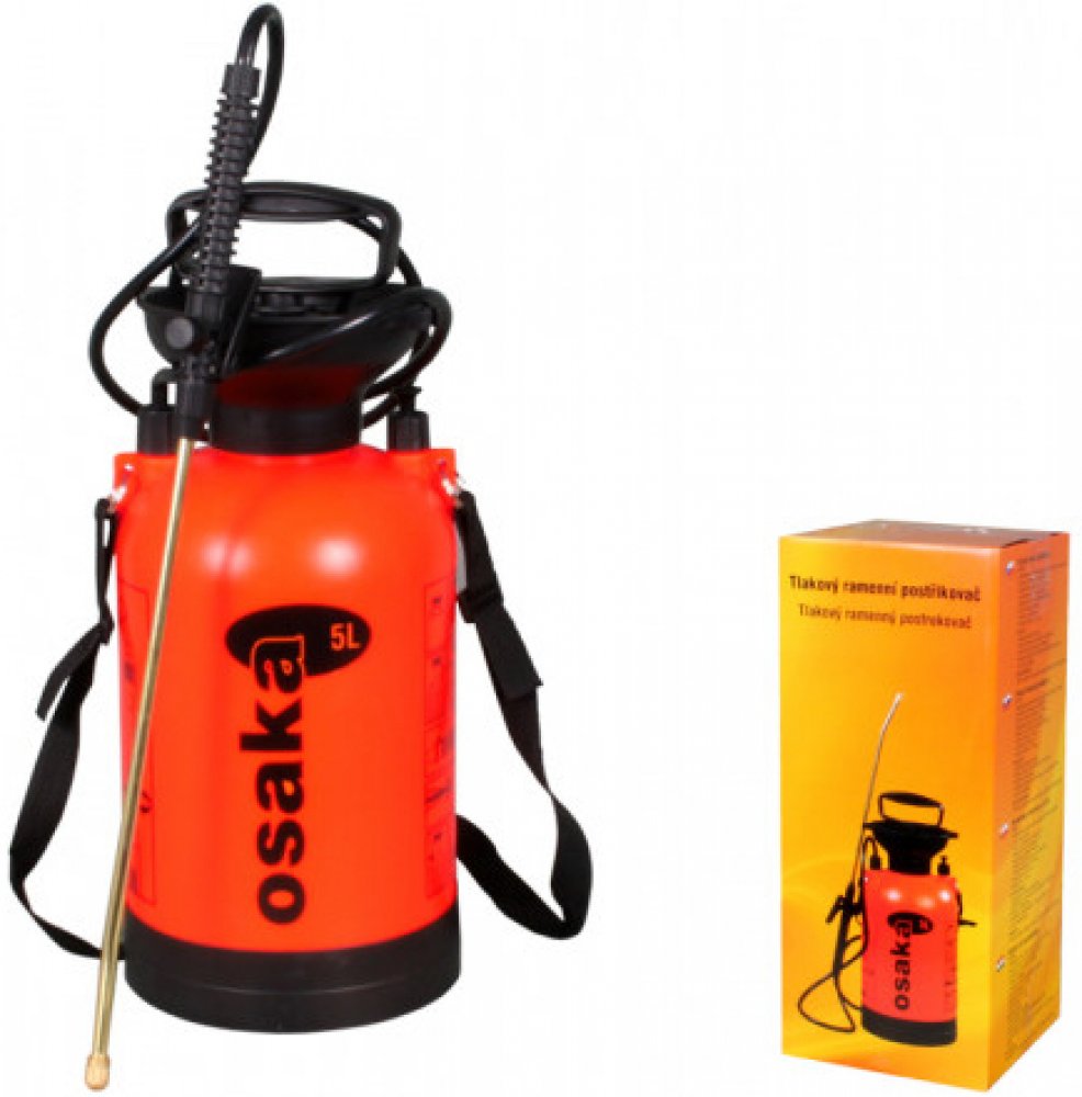 Postřikovač KWAZA tlakový ramenní 5lKuželovitý plastový oranžový tlakový ramenný rozprašovač s černou rozprašovací částí, která má mosaznou trysku. Na rameno se dá zavěsit pomocí černého popruhu. Rozprašovač je o objemu 5000ml, s rozměry: d. 18 x š. 38 x v. 43,2cm. Používá se k rosení, k hnojení postřikem na list a také k aplikaci chemických postřiků v exteriéru.