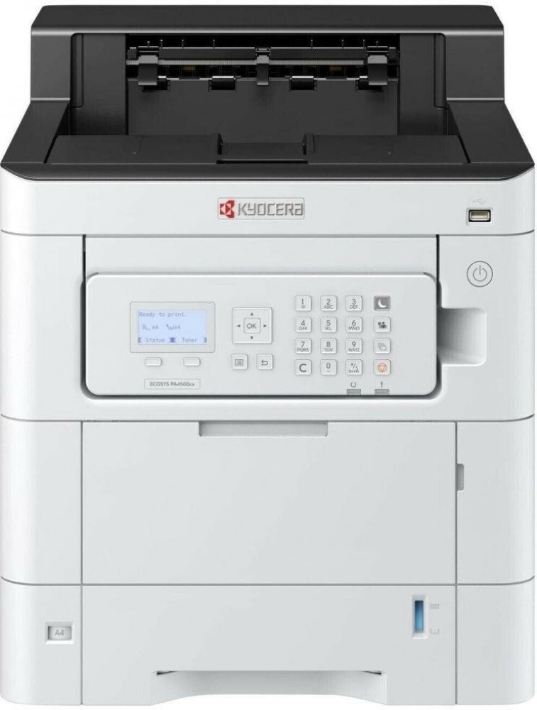 KYOCERA ECOSYS PA4500cx Printer A4 Färg 45ppm. Tisková technologie: Laser, Barva. Počet tiskových náplní: 4, Maximální zatížení měsíčně: 100000 stránek za měsíc. Maximální rozlišení: 1200 x 1200 DPI. Maximální velikost papíru série A standardu ISO: A4. Rychlost tisku (černá, normální kvalita, A4): 45 str. za minutu, Duplexní tisk. Displej: LCD, Barva: Černá, Bílá