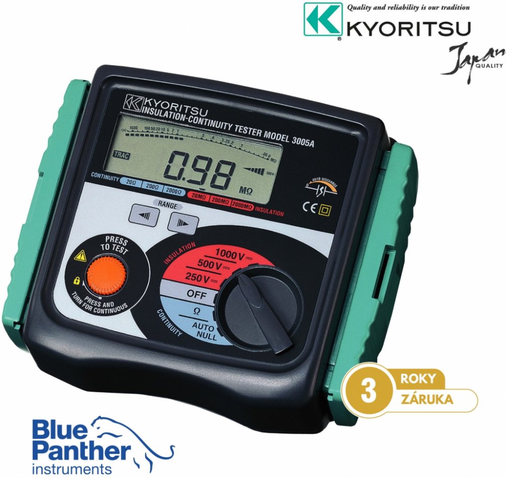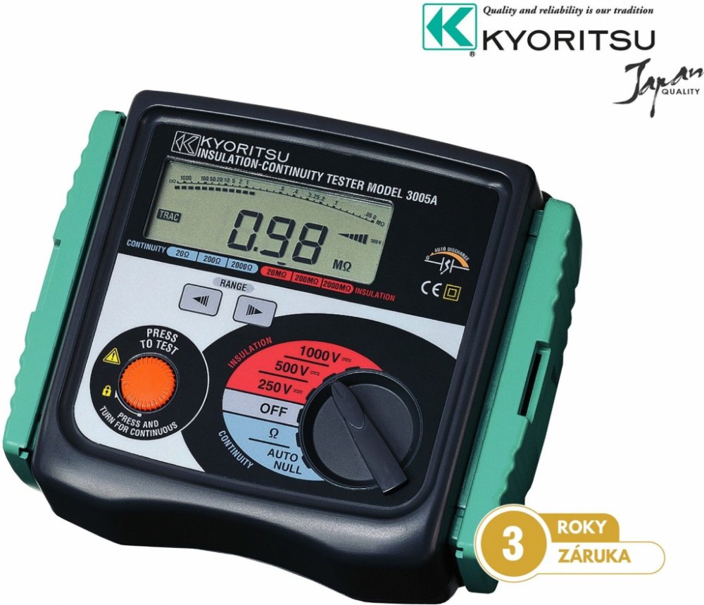 Digitální měřič izolačního stavu KEW3005A je robustní přístroj do terénu. Měří izolační stav napětími 250V, 500V a 1000V. Dále měří přechodový odpor proudu 200mA. Má dobře čitelný velký displej s digitální i analogovou stupnicí (bargrafem). Analogová stupnice indikuje velikost přiloženého měřicího napětí Při měření přechodového přístroje KEW 3005A automaticky nuluje vliv měřicích kabelů a přechodo...