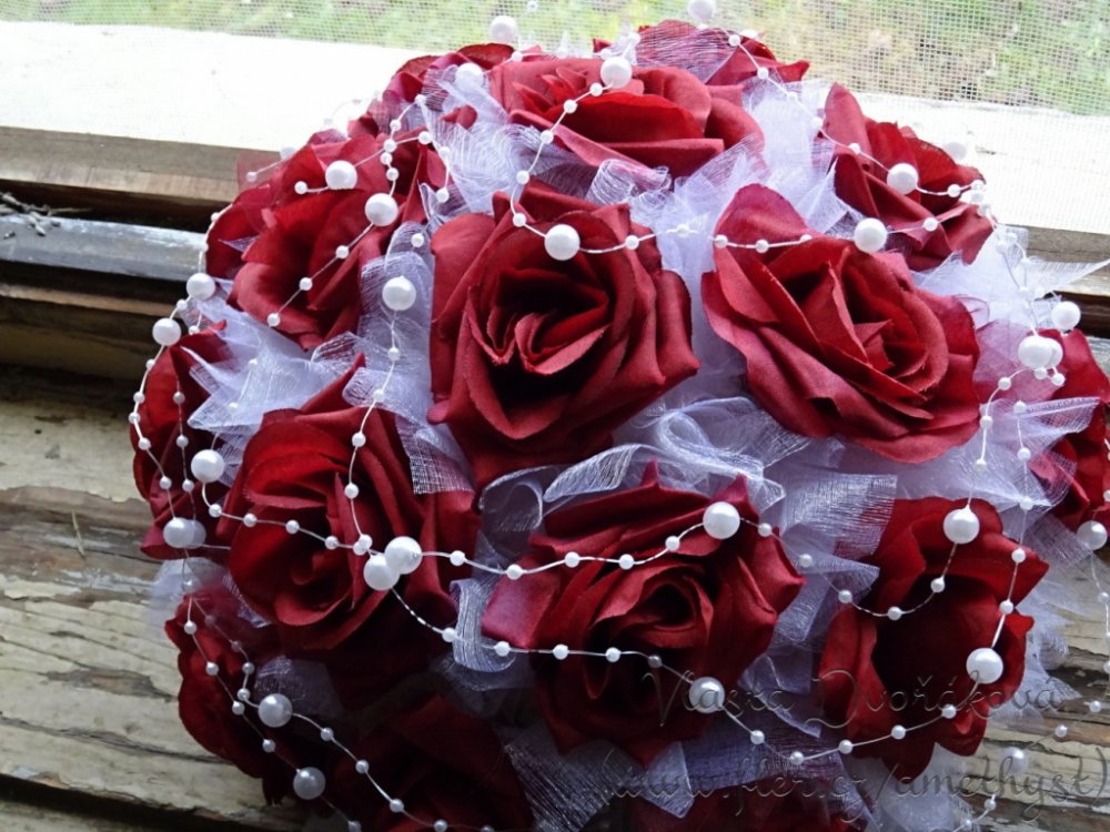 Polystyrenový základ s látkovými růžemi, záplavou bílé organzy a perličkami.