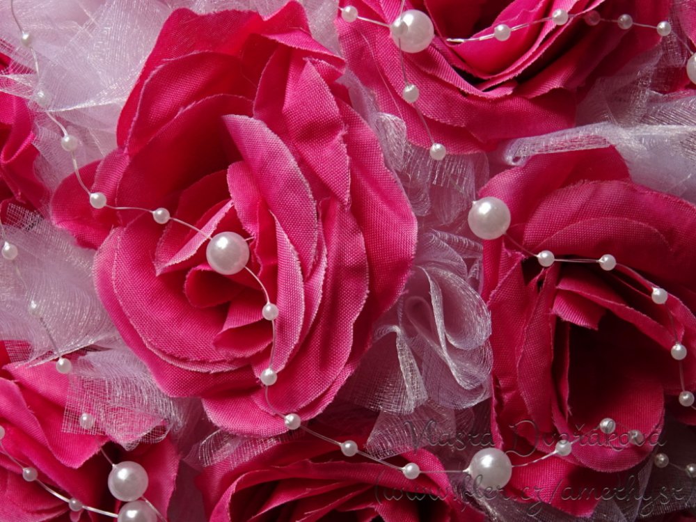 Polystyrenový základ s látkovými růžemi, záplavou bílé organzy a perličkami.