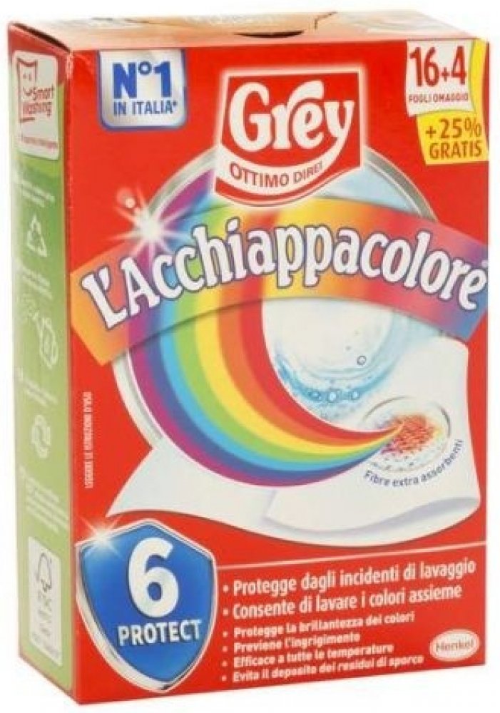 L´acchiappacolore Protegge & Ravviva i Colori ubrousky na praní proti zabarvení prádla se 3 účinky ochrany prádla. Ode dneška můžete prát jak barevné, tak bílé prádlo dohromady a nikdy se nezabarví. Díky tomu tak šetříte čas a peníze. Některé oděvy pouští přebytečné barvy a ty se pak přenáší na další kousky oděvů. Díky technologii L´Achiappacolore (pohlcovač barev), která funguje jako magnet pohlcuje přebytečné barvy a zajišťuje tak maximální ochranu dalšího světlejšího prádla. Důkaz je v ubrousku. Inovativní technologie Ravviva i Colori obnovuje intenzitu barev praní co praní a zabraňuje vyblednutí vláken. Biologicky rozložitelná textura ubrousku je 100% z přírodních materiálů. Lze je použít i v sušičce prádla při sušení kombinovaného prádla. Jednička na italském trhu. Dovoz Itálie.