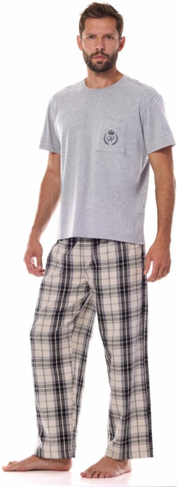 Pánské dvoudílné pyžamo, které kombinuje pohodlí a styl. Skládá se z jednobarevné tričko s krátkým rukávem. Na jeho hrudi je malá, dekorativní výšivka. Spodní část pyžama tvoří kalhoty z teplé flanelové látky v károvaném vzoru. Nohavice jsou dlouhé, rovně střižené. Pas příjemně pružný. Po stranách praktické kapsy, ideální pro uložení drobností nebo jen pro zahřátí rukou. Klasické pánské pyžamo pro chladnější večery, kdy oceníte nejen jeho komfort, ale také výborné hřejivé vlastnosti.