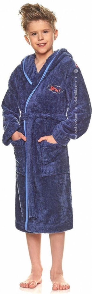 Dětský župan s kapucí, v pase uvázaný. Vyrobeno z měkké látky, pohodlné kapsy na bocích, nášivka všitá ve výšce hrudníku. Hezké a příjemné na dotek.