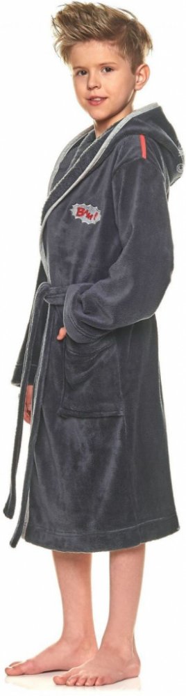 Chlapecký župan s kapucí, v pase uvázaný, vyrobený z měkkého, měkkého úpletu, pohodlných kapes na bocích. Na hrudi je jemný potisk. Hezké a příjemné na dotek.