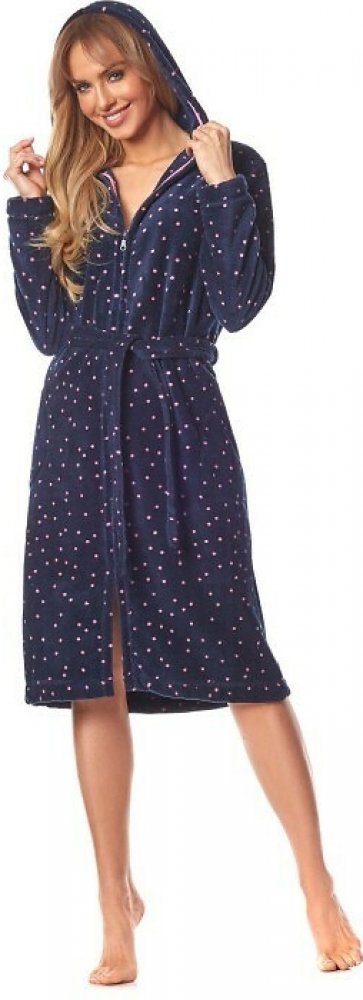 - vyrobeno z měkké pleteniny s puntíky- dámský župan s kapucí- dámský župan na zip- jemná aplikace ve výšce hrudníku- zavázané v pase- kapsy po stranách- ideální na domácí pohodu i chladnější večery