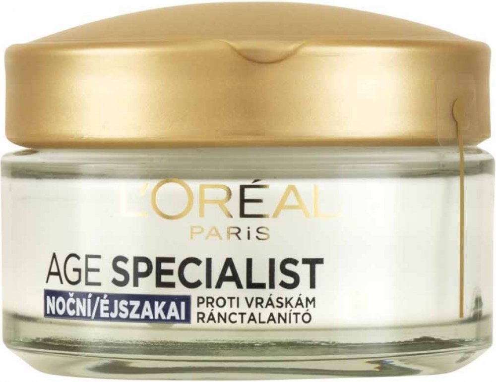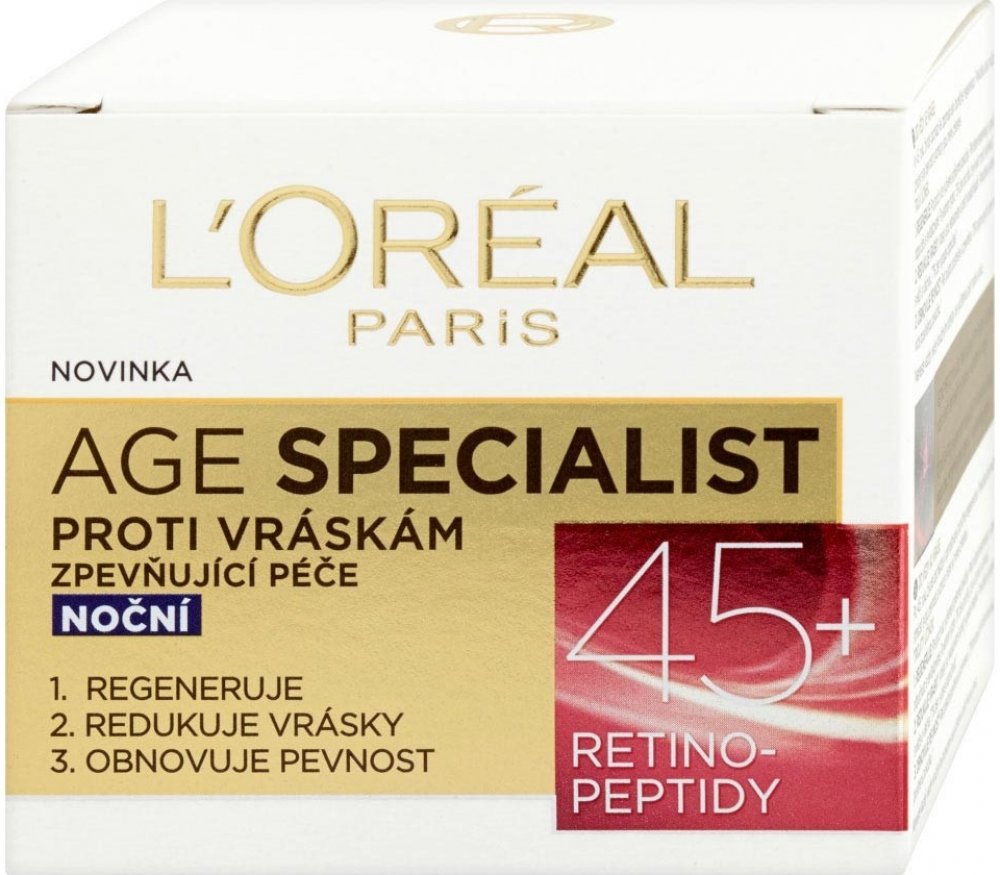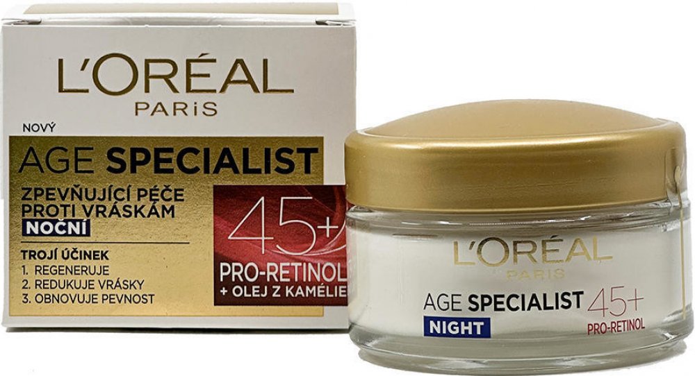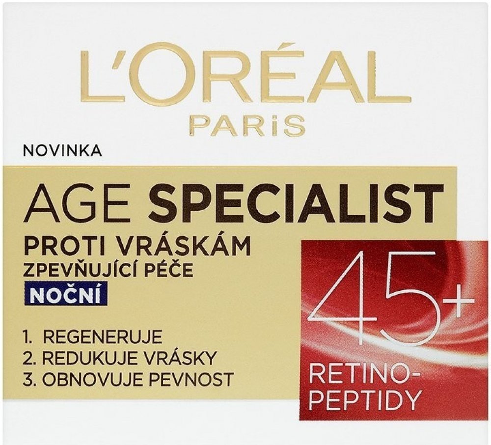 LOréal Paris Age Specialist Zpevňující noční krém proti vráskám díky obsahu Pro Retinolu a peptidů napomáhá horní vrstvě pokožky zvané epidermis v její regeneraci Navíc na pleť působí trojím účinkem Zmírňuje viditelnost hlubokých vrásek a pozitivně působí i na elasticitu a jemnost pleti Krém ...