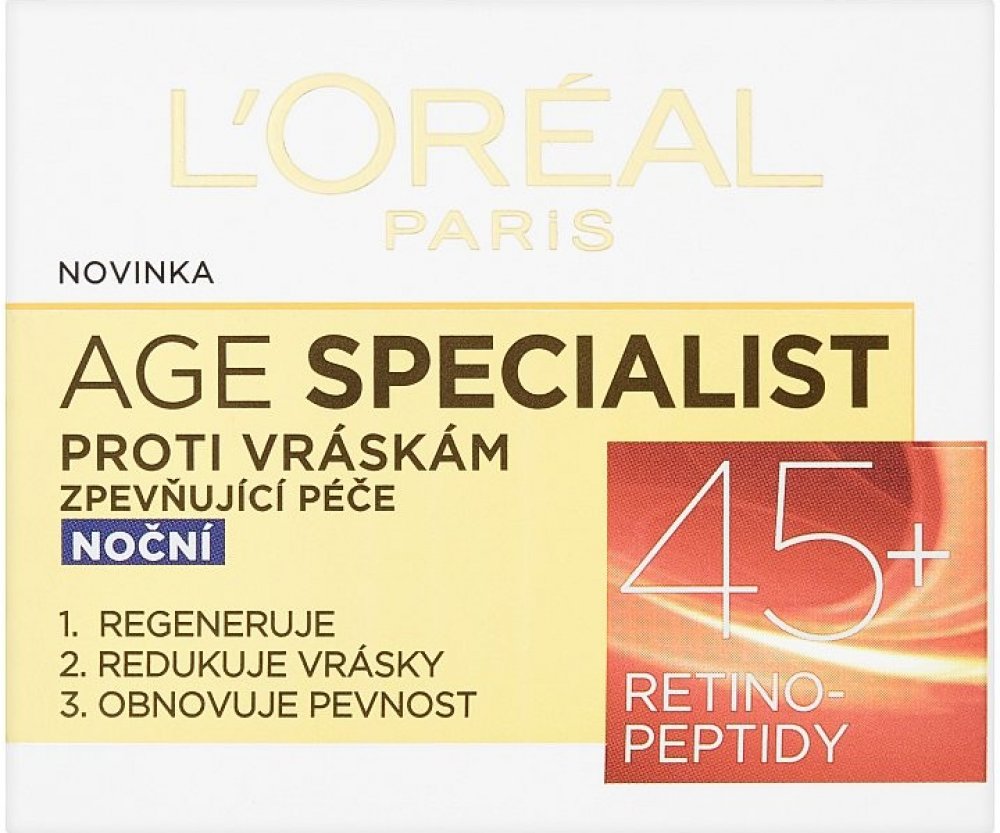 LOréal Paris Age Specialist Zpevňující noční krém proti vráskám díky obsahu Pro Retinolu a peptidů napomáhá horní vrstvě pokožky zvané epidermis v její regeneraci Navíc na pleť působí trojím účinkem Zmírňuje viditelnost hlubokých vrásek a pozitivně působí i na elasticitu a jemnost pleti Krém pozitivně působí i na revitalizační proces pleti vyživuje ji a dodává svěží a odpočatý vzhled LOréal Paris Age Specialist Zpevňující noční krém proti vráskám svými účinky navrací pleti její pevnost a společně s ní i mladý vzhled