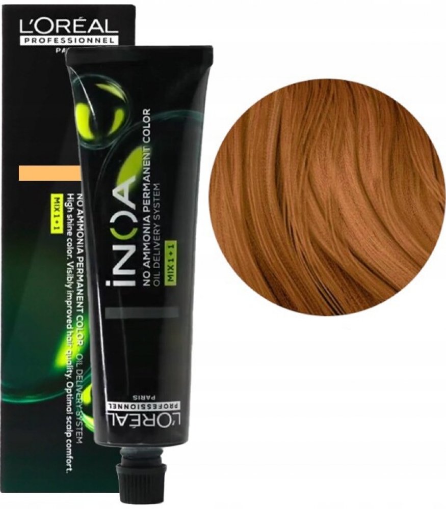 Barva na vlasy L´Oréal INOA Coloration 60ml je barva s ODS technologií (systém přenosu oleje). Zesvětlení až o 3 stupně za 35 minut. Barva překryje až 100% bílých vlasů. Snadno se smíchává a aplikuje. Výsledkem bude lesklá, rovnoměrná a dlouhotrvající barva vlasů.