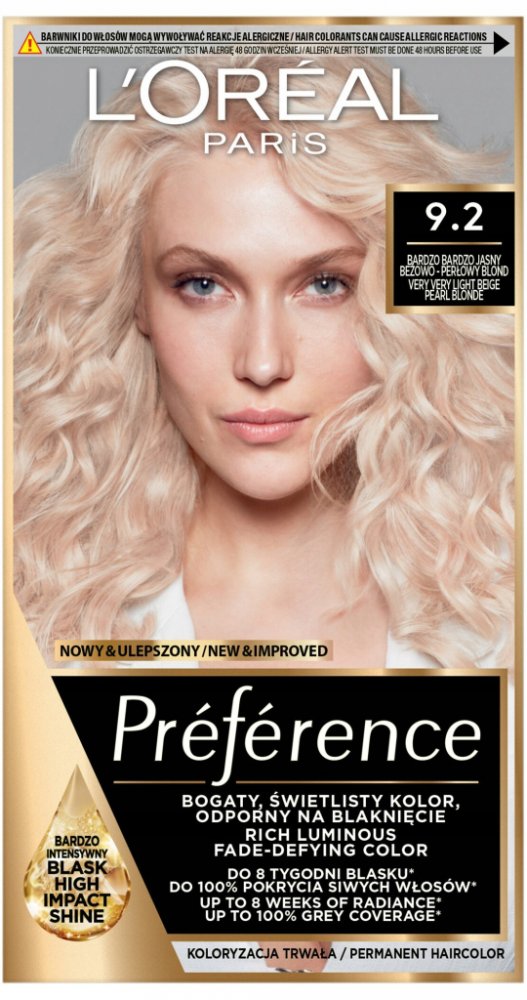 Préférence - Permanent Haircolor 92 WARSAW od značky L'Oréal. Trvalé, luxusní barvení vlasů. Byla vytvořena na základě vysoce kvalitních barviv a poskytuje dlouhotrvající, intenzivní odstín až po dobu 8 týdnů od nanesení. Navíc je produkt obohacen o aktivátor lesku, který poskytuje efekt rozjasňujících odlesků. Sada obsahuje: gel, oxidační krém, kondicionér, příbalový leták s návodem k použití a také pár vysoce kvalitních rukavic. Barva je k dispozici v odstínu 92 Velmi světlý béžovo-perleťový blond.