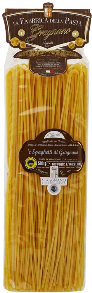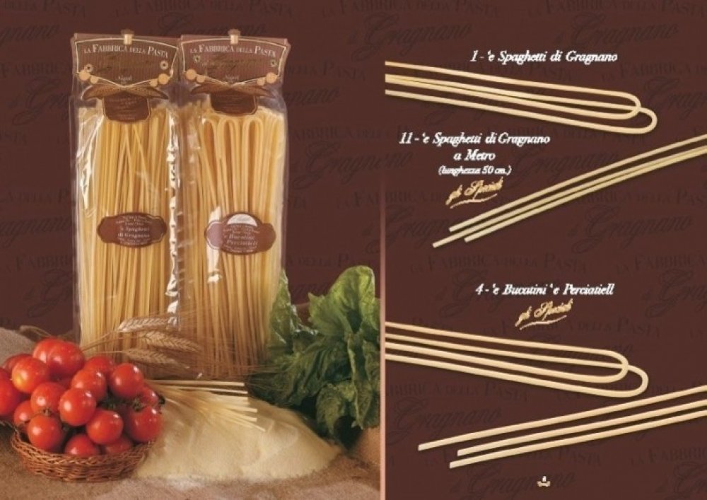 Pouze přírodní přísady, voda a mouka z tvrdé pšenice, která neobsahuje žádné barviva, aromatické nebo konzervační látky.Výroba těstovin v Gragnano je starověká forma umění, která zahrnuje historii, kulturu, trpělivost, tajemství a tradice už více než 500 let. Narodit se a vyrůstat v Gragnano, znamená být obklopen povznášející chutí a vůní tvrdé pšenice a těstovin, které odsud pochází. La Fabbrica della Pasta di Gragnano je rodinná firma, která pokračuje v tradici po svém otci, který kdysi koupil starou a upadlou továrnu na výrobu těstovin. Vynaložil všechen svůj čas a úsilí do rekonstrukce této továrny, stejně jako do propagace tradičních těstovin z Gragnano. To se povedlo a těstoviny z Gragnano dnes zaznamenávají komerční úspěch v celém světě.
