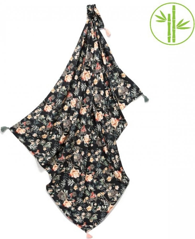 La Millou Luxusní bambusová multifunkční zavinovací deka - BLOOMING BOUTIQUE NOIR. Vyrobená z tkaniny ze 100% bambusové viskózy. Poskytuje široký způsob možného využití jako moderní zavinovačka "kokonek", lehká letní deka, sluneční clona na/přes kočárek, dětské letní pareo a mnohé další.
