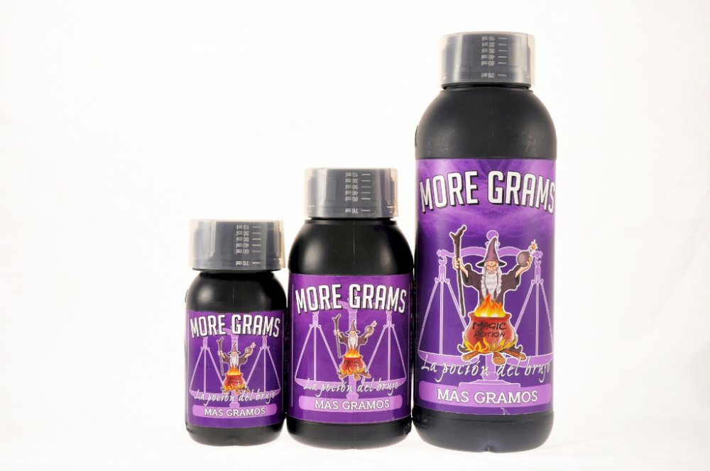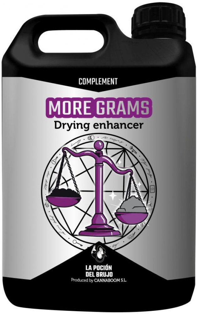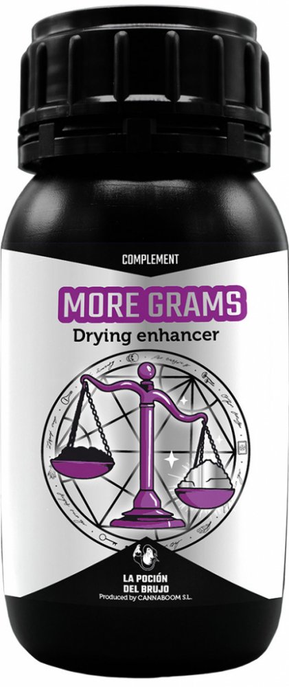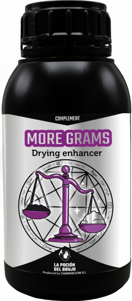 MORE GRAMS je světově unikátní přípravek: díky němu vaše plodiny v procesu sušení ztrácejí méně na hmotnosti. Funguje tak, že zvyšuje retenci vody v květu, opětovně hydratuje prostor mezi vlákny a umožňuje asimilaci této vody bohaté na živiny v závěrečné fázi kvetení. Organická hmota se zvýší těsně před řezem, což umožní, aby květ během fáze sušení ztratil o 10 % / 20 % méně hmotnosti.