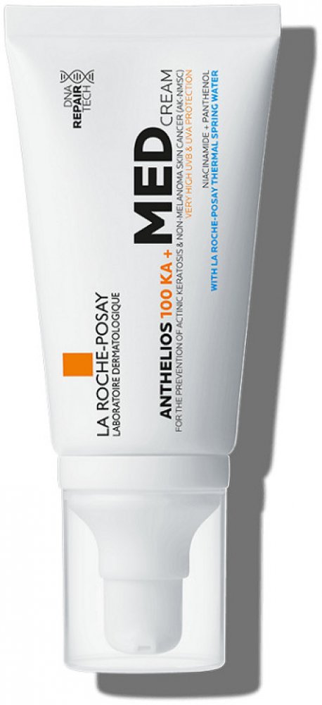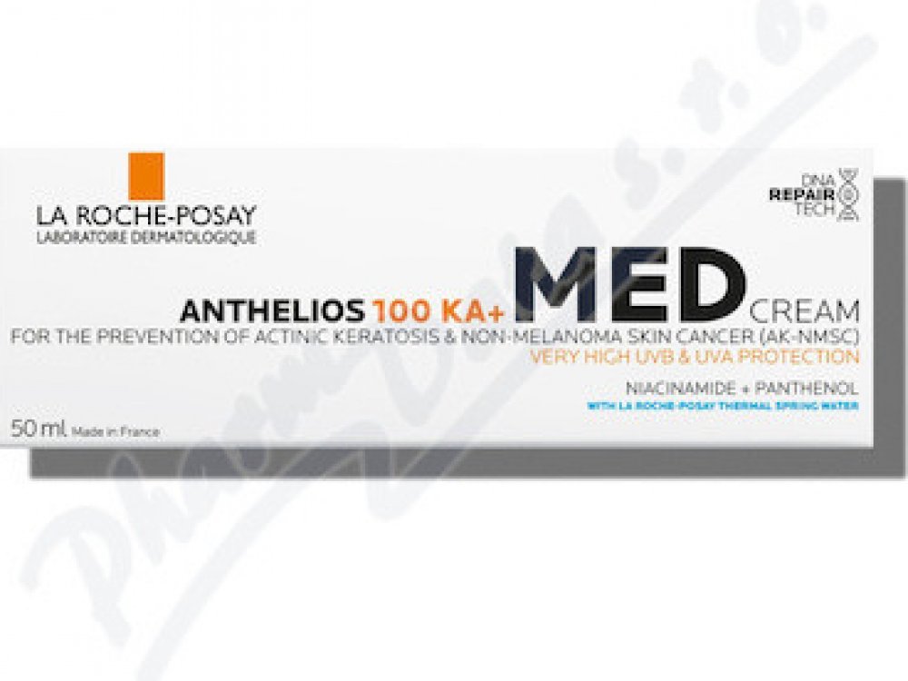 VLASTNOSTI: ANTHELIOS 100 KA+ MED KRÉM se používá k prevenci vzniku aktinické keratózy (AK) a nemelanomové rakoviny kůže (NMSC) a ke snížení rozsahu kožních nádorů v rámci širší léčby. Velmi vysoká širokospektrá ochrana před UVA a UVB zářením díky fotostabilnímu filtračnímu systému obsahujícímu patentovaný Mexoryl® proti vzniku rakovinových (nemelanomových) a prekancerózních aktinických lézí, jakož i proti sluncem vyvolaným lézím DNA u pacientů s vysoce fotosenzitivní pokožkou rizikem výskytu aktinické keratózy nebo u pacientů, kteří jsou podrobeni imunosupresivní léčbě. Hydratační složení s obsahem technologie DNA REPAIR TECH je obohaceno o NIACÍNAMID a PANTENOL.