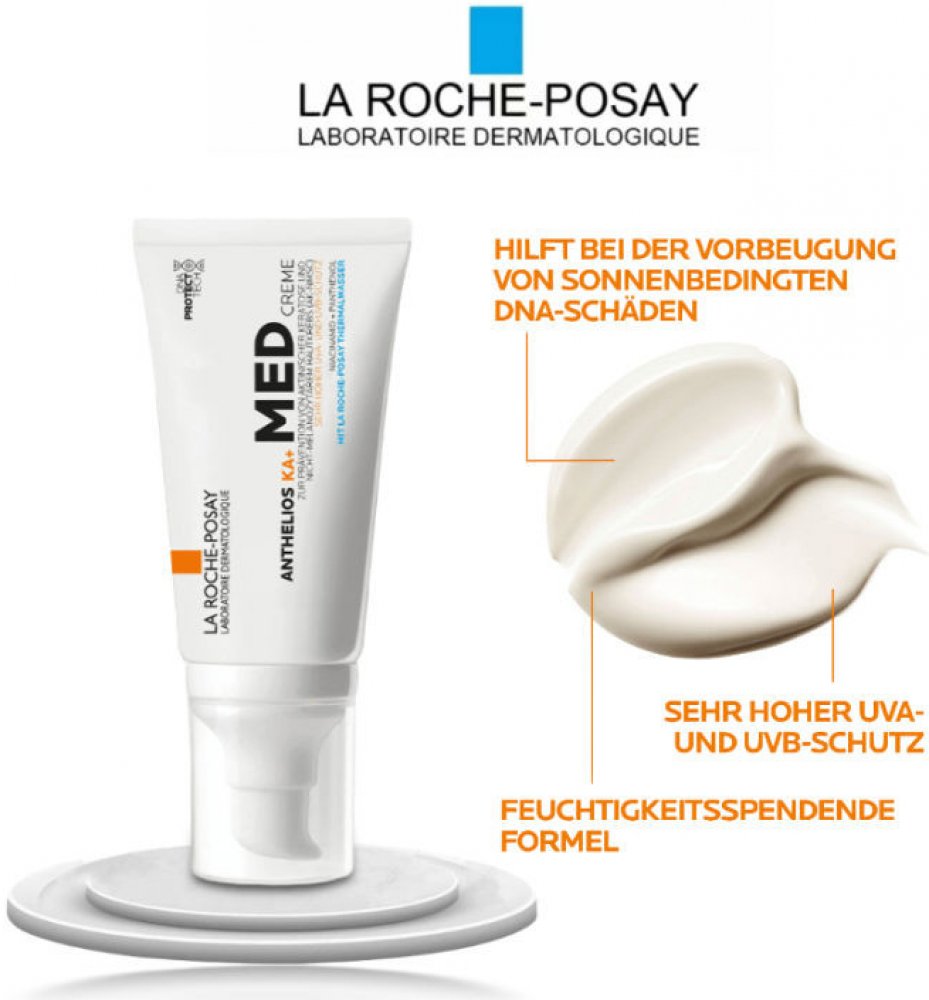 La Roche-Posay Anthelios 100 KA+ MED krém - zdravotnická pomůcka - krém bez parfému. INDIKACE: UV záření je jedním z hlavních faktorů, které přispívají ke vzniku aktinické keratózy a rakoviny kůže. Aktinická keratóza se vyznačuje hrubými, drsnými, šupinatými nebo až strupovitými skvrnami na místech, která jsou nejčastěji vystavována slunečnímu záření, jako je tvář (včetně linie vlasů a vlasové pokožky), uši, krk, ramena a ruce. Nejvíce ohroženi jsou lidé se světlou pokožkou (fototypy I-II). Skvrny aktinické keratózy jsou předrakovinné oblasti na kůži a jsou znakem poškození DNA v kůži, a také zvýšeného rizika vzniku nemelanomové rakoviny kůže.