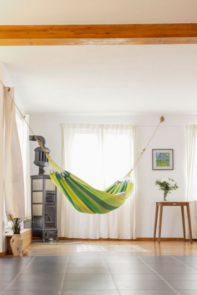 Houpací síť MODESTA SINGLE STRIPES - jungle Houpací síť Modesta Single Stripes je hamaka vyrobena ze 100% organické bavlny. To znamená, že se pěstuje z geneticky neupravených semen, bez herbicidů, pesticidů či syntetických hnojiv a za pomoci střídavého hospodářství, které zachovává přirozenou úrodnost půdy. Síť je určená pro jednu osobu. Modesta je vybavena velkým počtem závěsných šňůr. Ty zajišťují rovnoměrné rozložení váhy, neuvěřitelný komfort a dlouhou životnost. Odolnost sítě navíc zvyšují zesílené okraje proti roztržení. Hustota látky je 278 g/m2. Hmotnost hamaky je 1,1 kg a je dodávaná v úspornom zrolovanom balení. Může se prát v pračce na 30°C. Je držitelkou certifikace GOTS (The Global Organic Textile Standard), co je celosvětově uznávaný certifikační systém pro trvale udržitelnou produkci textilií, který definuje přísná ekologická a sociální kritéria. Jak síť pověsit medzi stromy a jak v interiéru? Jak si do sítě lehnout? U klasických houpacích sítí je nejpohodlnější diagonální poloha, při které se síť pěkně rozevře. Vaše páteř bude příjemně narovnaná, krk a hlava podepřené v pohodlné poloze. Samozřejme, že ani podélne ležení není špatné. Je sice méně pohodlné ale jestli chcete mít svůj klid, je to taky možnost. Látka vás pěkně obejme ze všech stran a vy se do sítě můžete zavřít jako do kokonu.
