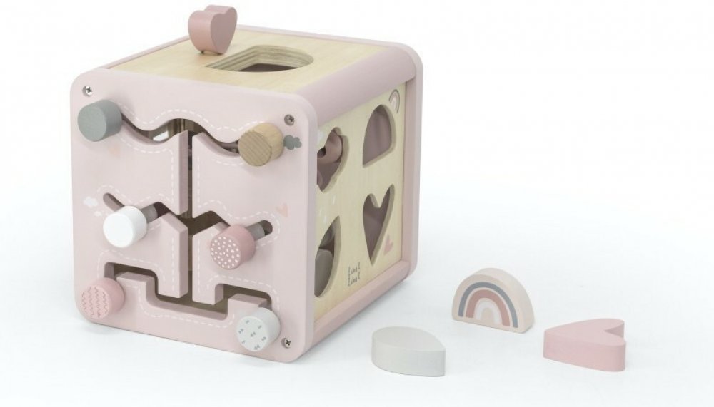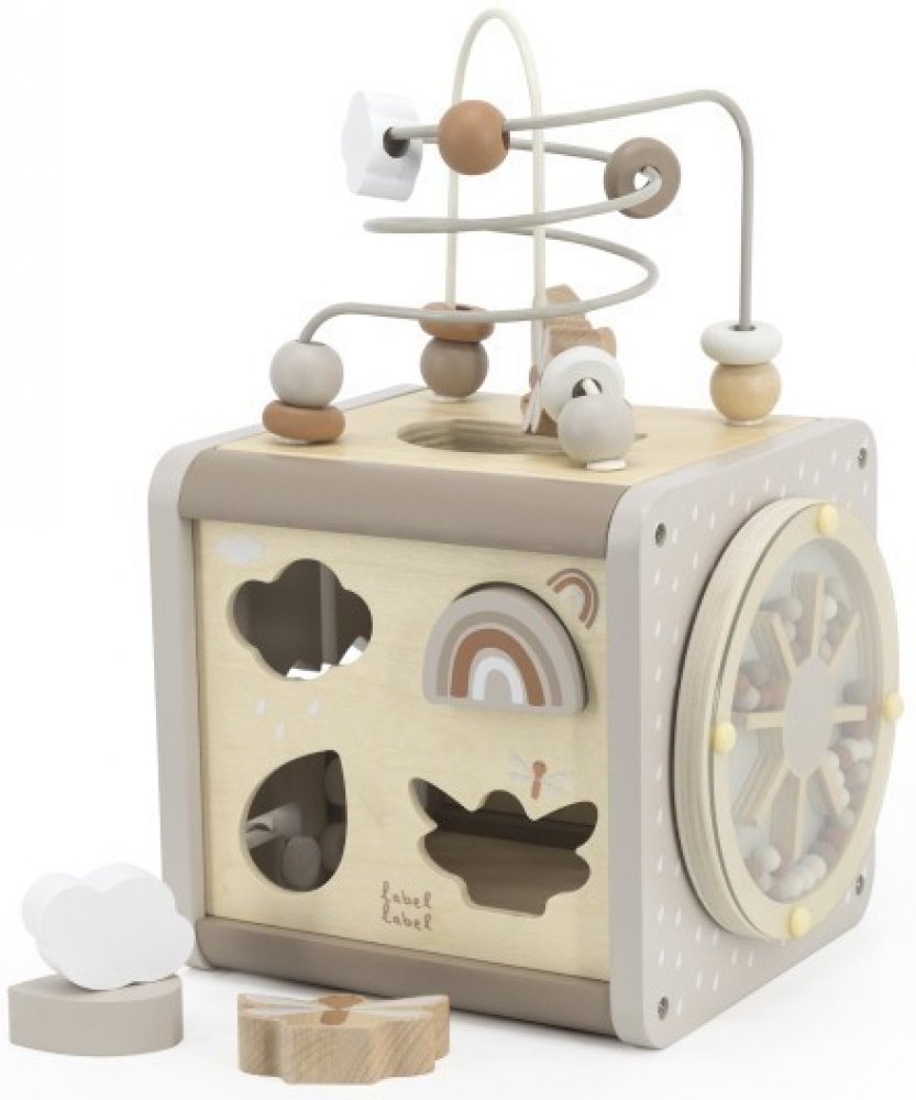 Kostka s aktivitami 5 v 1 belgické značky Label Label obsahuje vkládačku tvarů, ozubená kolečka, bludiště, xylofon a labyrint z korálků, který děti zcela jistě zaujme. Bludiště z korálků můžete od kostky oddělit a dostanete tak dvě samostatné hračky.