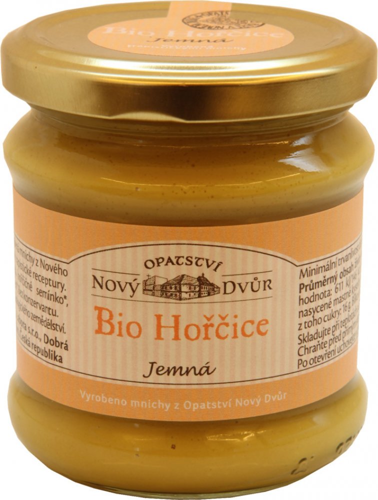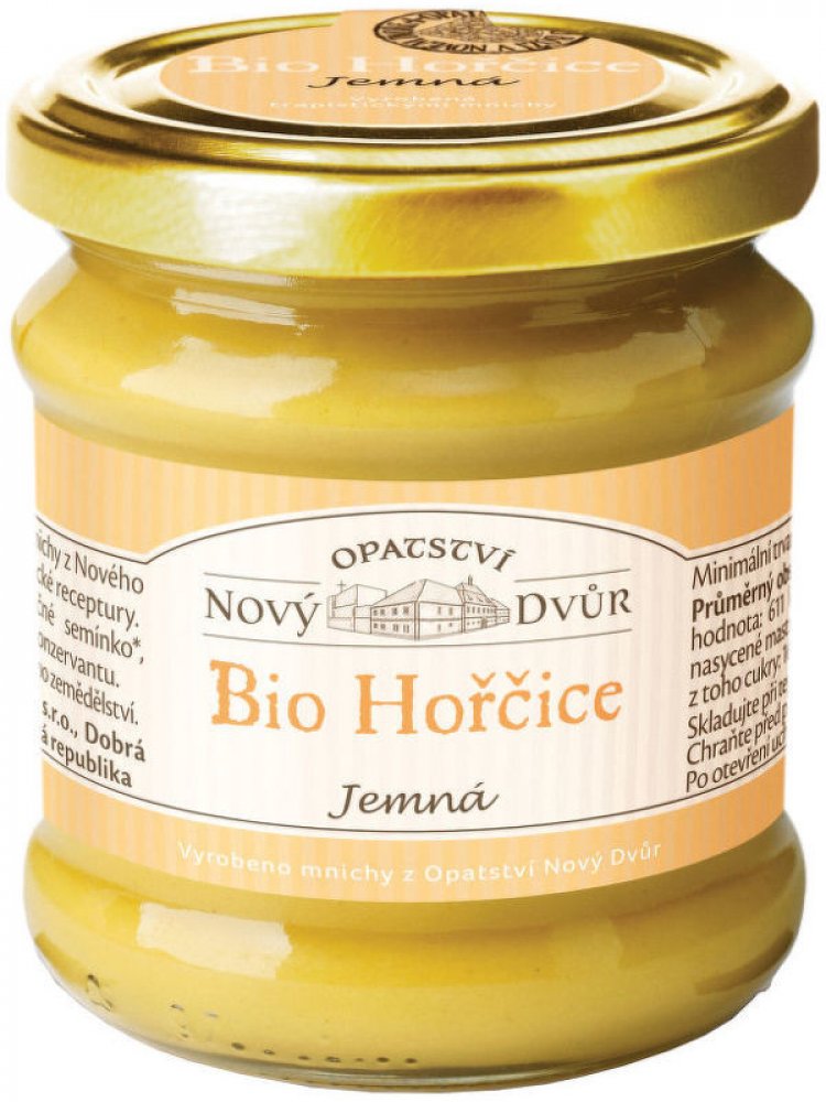 Tato hořčice má jemnou nasládlou chuť a nepálí. Hodí se do bramborového salátu, salátových zálivek a výborně doplňuje chuť masa, uzenin či sýra. Lze ji použít i k přípravě pomazánek, omáček a dresingů a marinování masa či zeleniny. Je vyráběna řemeslně a v malém objemu podle originální trapistické receptury mnichy z opatství Nový Dvůr. Tradičně, každý klášter řádu se musí uživit prací svých mnichů. V klášteře Nový Dvůr se vyrábí hořčice, chovají ovce a pracuje v lese. Hořčice z Nového dvora je velmi kvalitní výrobek, příbuzný francouzské hořčici nazývané „Moutarde à l’ancienne“, což je možno přeložit jako „Starofrancouzská hořčice“. Vyrábí se z vybraného hořčičného semínka, které je nejprve namočeno do směsi octa a vody z lesů obklopujících klášter. Poté je rozdrceno na mlýnském kameni a dochuceno ostatními přísadami. Ochucená hořčice je ručně plněna do sklenic, kde během několika týdnů dozrávání získává své nezaměnitelné aroma, které ji tak výrazně odlišuje od konkurenčních výrobků.