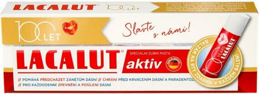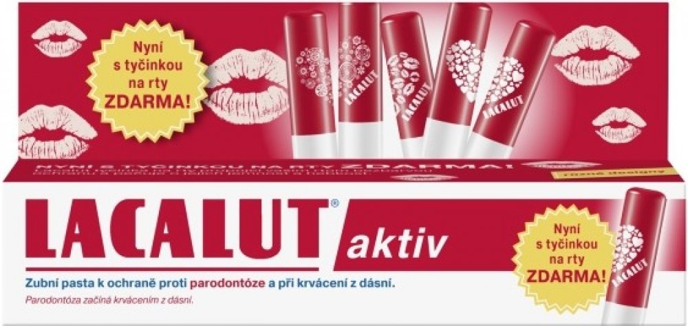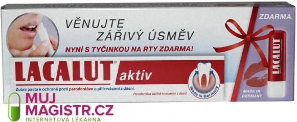 dárkové balení zubní pasty Zubní pasta Lacalut aktiv je prostředkem, sloužícím k prevenci před parodontózou a má výrazné stahující účinky. Účinnou látkou je aluminium laktát, který vykazuje výrazné adstringentní (stahující) účinky. Posiluje parodont a zastavuje krvácení dásní. Přítomné složky alantoin a bisabolol zabezpečují protizánětlivý účinek. Přítomné fluoridy (1 360 ppm fluoru) zpevňují zubn...