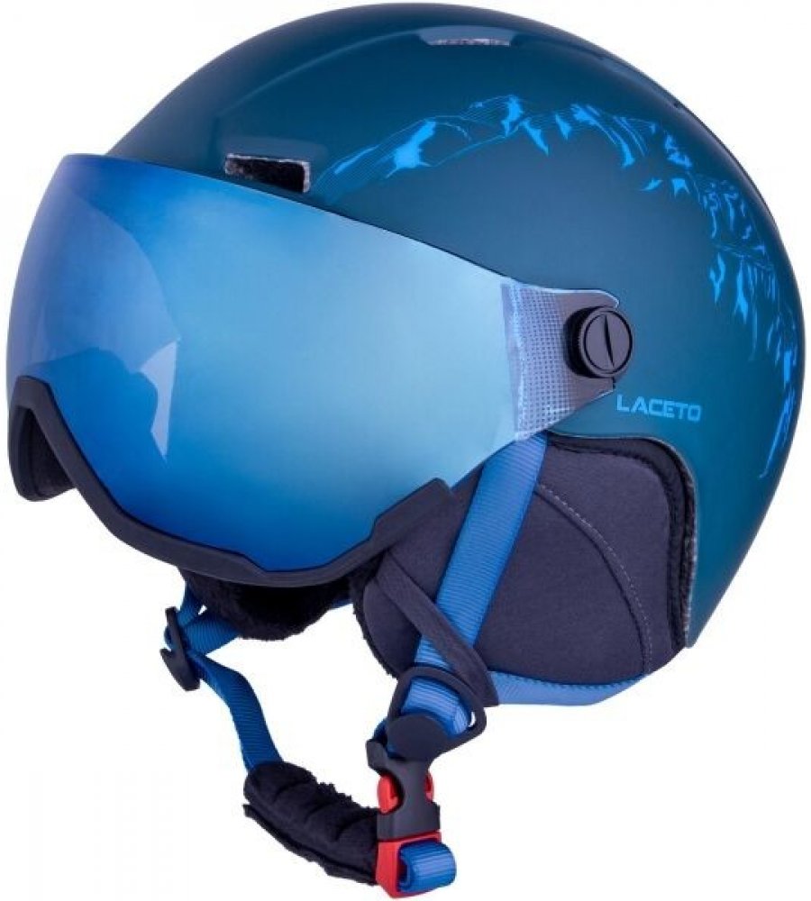 Dětská lyžařská helma Laceto MOUNT se hodí pro všechny děti s obvodem hlavy mezi 50-54 cm. Helma s motivem pohoří má nastavitelnou velikost, pomocí otočného kolečka na zadní straně helmy. Helma má sklopný visor v provedení modré REVO s kategorií filtru S2. Tento visor je možno demontovat či vyměnit za jinou barvu. Nad kolečkem se také nachází uchycení lyžařských brýlí. Tam umístíte jejich pásek a zajistíte, že vám během lyžování nespadnou a neztratí se. Aby byly při lyžování hlava a uši v pohodlí, má helma Laceto hřejivý umělý kožíšek, který krásně udrží teplo. Zároveň má větrací otvory, které pomáhají chránit před pocením. Pro pohodlné nošení je na nastavitelném popruhu pod bradou umístěno měkčení, které chrání před nepříjemným tlakem pásku. Helma Laceto MOUNT je ozdobena obrázkem pohoří.