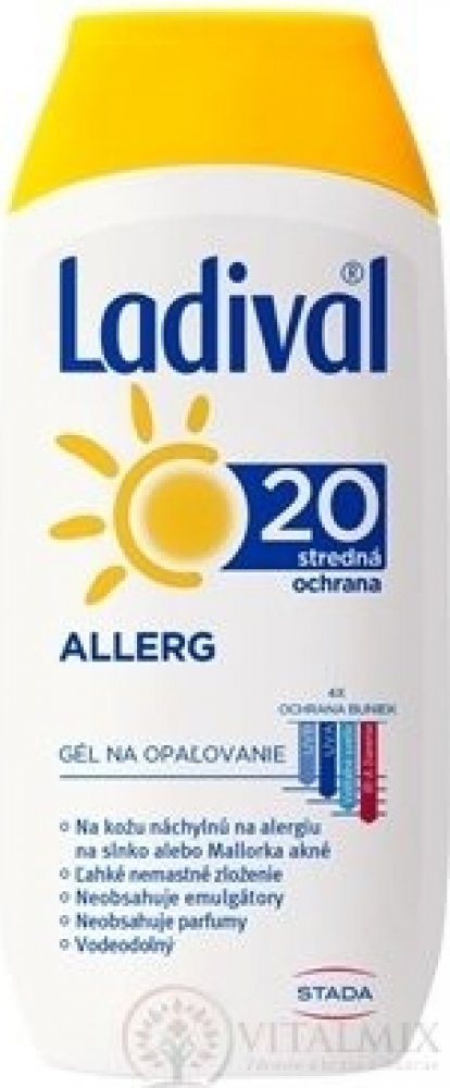 Ladival Allerg OF20 gel 200 ml Zajišťuje čtyřnásobnou ochranu buněk nejen před UVB a UVA zářením, ale také před IR-A zářením a viditelným světlem včetně modrého světla. Ideální pro alergickou nebo mastnou pleť se sklonem k akné.