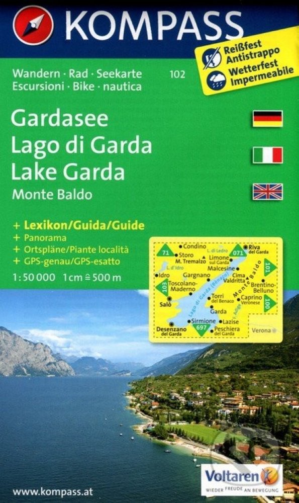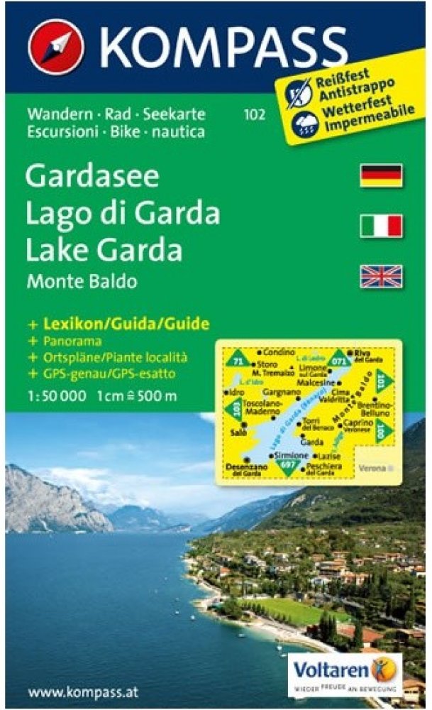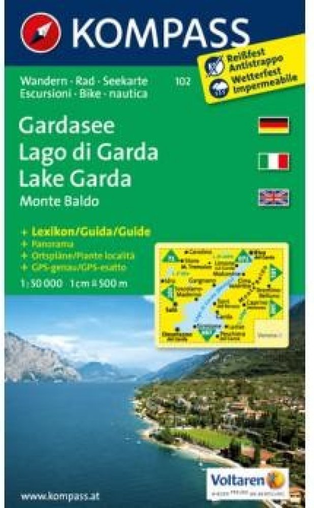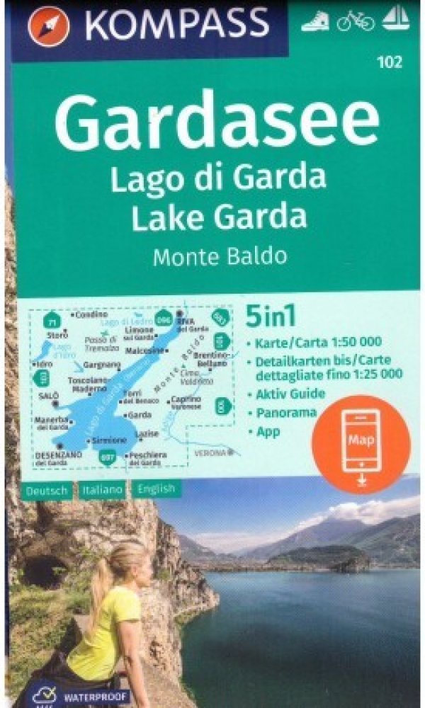 Die 5in1Wanderkarte ist jetzt noch übersichtlicher und besser lesbar. Die Wanderkarte ist mit einer zusätzlichen Karte im Detailmaßstab und einem Panorama ausgestattet. Der Aktiv Guide informiert Sie rund um das Thema Outdoor und die kostenlose App für unterwegs gibt es auch noch dazu. Das bildet die perfekte Grundlage für die Planung einer Wandertour. Die präzise Kartografie zeigt alle begehbaren Wanderwege inklusive Klassifizierung. Informationen wie Schwimmbäder, Klettersteige, Kinderspielplätze, Hütten und vieles mehr sind in der Karte ebenfalls enthalten. Dank der reiß- und wetterfesten Papierqualität ist die Karte bei jedem Wetter ein treuer Begleiter.Eines der meist besuchten Ausflugs- und Urlaubsziele Europas, über 2 Millionen Gäste pro Jahr, vor allem für Sport- und Badefreunde. Speziell der nördliche Bereich ist Outdoormagnet: Surfen, Klettern, Biken, Wandern, Paragleiten... Seinem mediterranen Klima ist es zu verdanken, dass in dieser Südalpenlandschaft Oliven, Zitronen und fruchtige Weine gedeihen sowie Zypressen, Pinien oder Palmen zu finden sind. Viele Touren entlang ehemaliger Frontlinien des 1. Weltkrieges in felsigen Bergflanken, die durch Ex-Stellungen und Höhlen wie ein Schweizer Käse durchbohrt sind. Touren für jedermann: Spaziergänge am Ufer oder zu Bergdörfern, Entdeckungen in der Natur oder die Besteigung der wichtigsten Gipfel. Eindrucksvolle Panoramablicke sind dabei auf fast jeder dieser zu erwarten. Der alpine Gebirgskamm des Monte Baldo, vor allem im Bereich der Cima Valdritta, zieht jedes Jahr Bergsteiger in seinen Bann und fordert Kondition und Mut. Als Gegenleistung gibt es ein einzigartiges Dauerpanorama.