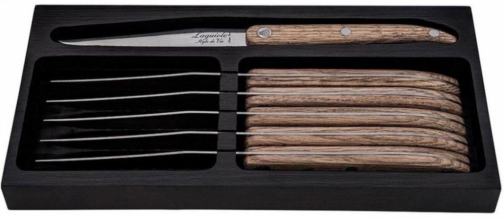 Sada steakových nožů LAGUIOLE Style de Vie - Innovation představuje designové a kvalitní nože s rukojetí z dubového dřeva, velice příjemně se drží a dodává noži patřičnou eleganci. Kvalitní vroubkovaná čepel z nerezové oceli má tloušťku 1,8 mm a snadno s ní nakrájíte váš dokonale připravený steak.