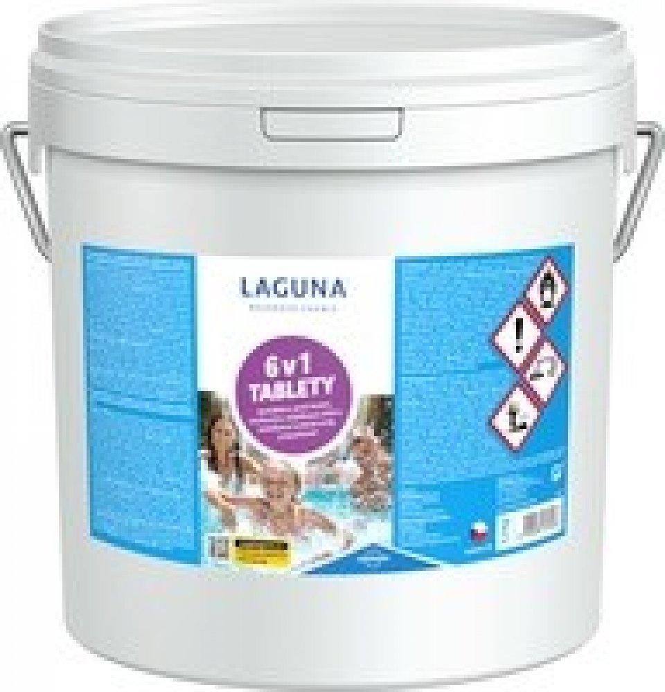 LAGUNA TABLETY 6 v 1 je moderní víceúčelový přípravek pro celosezónní průběžnou údržbu vody ve všech typech bazénů. Likviduje bakterie a řasy, zabraňuje jejich růstu, umožňuje vyvločkování nečistot, stabilizuje aktivní chlor, tvrdost vody, projasňuje (zlepšuje efektivitu filtrace). Před prvním použitím přípravku vždy upravte hodnotu pH na 6,8–7,6, proveďte počáteční šokovou dezinfekci vody rychlorozpustným chlorovým přípravkem Laguna chlor šok nebo Laguna modrý šíp. Tablety dávkujte sběračem (skimmerem), plovákem nebo jiným dávkovačem při zapnutém filtračním zařízení. Je nutné udržovat obsah aktivního chloru v rozmezí 0,3–0,8 mg/l a pH 6,8–7,6. Obsah chloru a hodnotu pH kontrolujte 1x týdně pomocí testerů (Laguna tester 4v1 nebo Laguna tester pH – chlor.Dávkování:- Dle teploty vody přidávejte každých 6–8 dnů 1–2 tablety (200–400 g) na 30 m3 (30 000 litrů) vody- 1 tabletu při teplotě do 25 °C- 2 tablety nad 25 °C