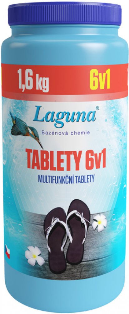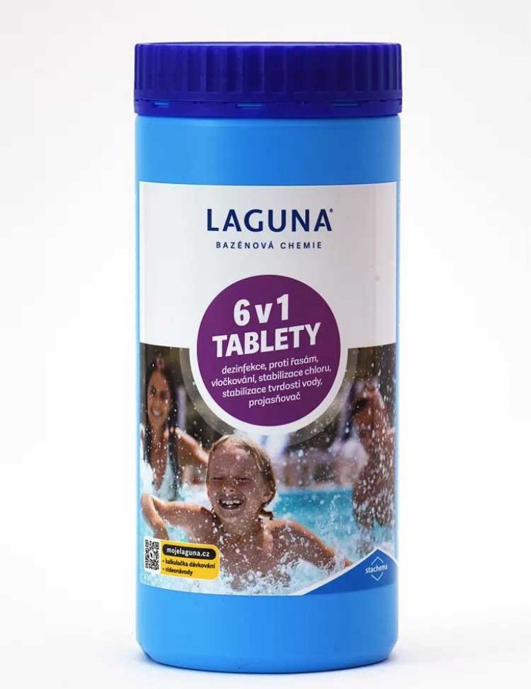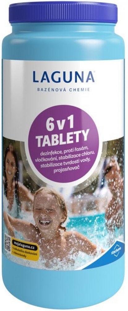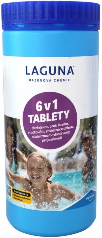 Laguna 6v1 tablety je moderní víceúčelový přípravek pro celosezónní průběžnou údržbu vody ve všech typech bazénů. Slouží jako dezinfekční přípravek, současně umožňuje vyvločkování nečistot, likviduje řasy a zabraňuje jejich růstu, stabilizuje chlor ve vodě, projasňuje-zlepšuje zachycení nečistot ve filtraci a stabilizuje tvrdost vody.