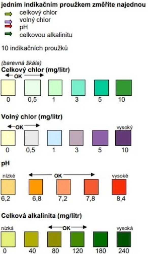 Návod k použití: Ponořte proužek do vody a ihned jej vyjměte. Držte proužek 15 sec (nesetřepávejte zbytky vody z proužku) a potom porovnejte barvu políčka pro celkový chlor, volný chlor, pH a celkovou alkalinitu s barevnou škálou na etiketě ...