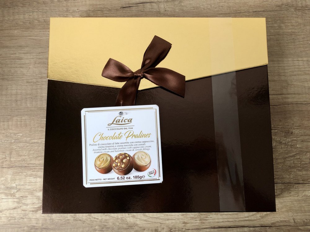Mix pralinek z mléčné čokolády s náplní.Složení: cukr, rostlinné oleje a tuky (palmové a řepkové v různém poměru), sušené plnotučné mléko (11%), kakaová hmota, kakaové máslo, sušená mléčná syrovátka, sušené odstředěné mléko, cereálie 1.7% (kukuřičná mouka, rýžová mouka, pšeničná mouka, cukr, extrakt z ječného sladu, sůl), laktóza, kakaový prášek se sníženým obsahem tuku, lískové ořechy (1.1%), káva, emulgátor (sójový lecitin), aromata. Může obsahovat jiné skořápkové plody.Uchovejte v suchu, chraňte před teplem.Vyrobeno v Itálii. Výrobce: LaicaVýživové údaje na 100g:Energie2265 kJ / 543 kcalTuky32gTuky - z toho nasycené19gSacharidy57gSacharidy - z toho cukry54gVláknina-Bílkoviny5.7gSůl0.26g