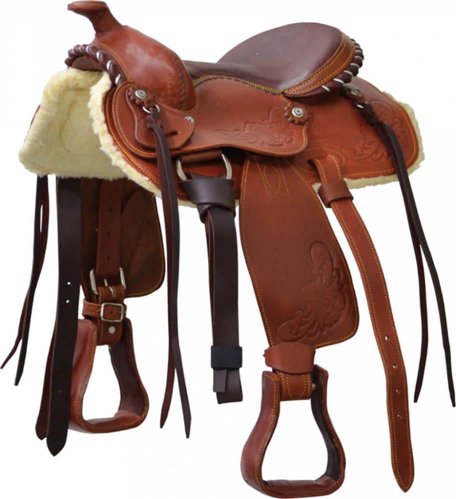 Westernové sedlo vyrobeno z kvalitní kůže. Posedlí je měkce polstrováno, potaženo hladkou kůží. Sedlo je na spodní straně podloženo měkkým umělým beránkem. Zdobeno květinovým vzorem a na přední i zadní rozsoše stříbrnou dekorací. Dodáváno včetně zadního podbřišníku. Dostupné také v černé barvě. Ve velikostech posedlí 8", 11" a 13".