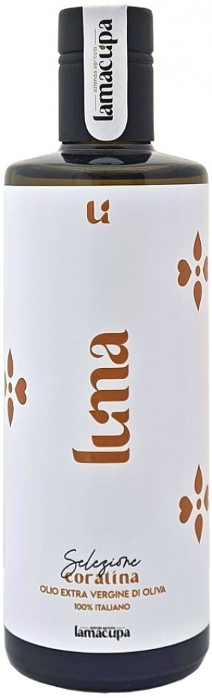 Olivová farma Lamacupa se nachází v samém srdci Apulie a může se pochlubit historií plnou přírody, lásky a vášně k ní. Dnes skvěle fungující rodinný podnik se zrodil ze životního projektu temperamentní Italky Maria Rosa Arbore a italského sympaťáka Luigi Malcangi. Maria Rosa a Luigi jsou životní společníci i vášniví farmáři v jednom prahnoucí po neustálém hledání dokonalosti a kvality. Nadšení, profesionalita a touha vychutnat si dokonalý extra panenský olivový olej je to, co oba pohání kupředu každý den. Extra panenský olivový olej vyrábí z odrůdy Coratina, která je typická pro oblast Puglia, jejíž název je odvozen od města Corato. Coratina je jako olivová odrůda velmi odolná a dobře se přizpůsobuje prostředí. Tento kultivar vyniká elegantní vůní, nezaměnitelnou chutí, výraznými organoleptickými vlastnostmi a v porovnání s jinými odrůdami i abnormálně vysokým podílem polyfenolů. Navíc extrakce za studena s použitím nejmodernější technologie umožňuje zachovávat všechny tyto kvality. Tak jako u ostatních olivových odrůd, tak i u Coratiny, je zcela zásadní odhadnout ten správný čas pro sklizeň oliv v ideálním stupni zralosti. Olivy Coratina zralé tak akorát a lisované do max. 6 hodin od sběru dávají krásně zelený olej se zlatožlutými odlesky s intenzivní ovocnou chutí.