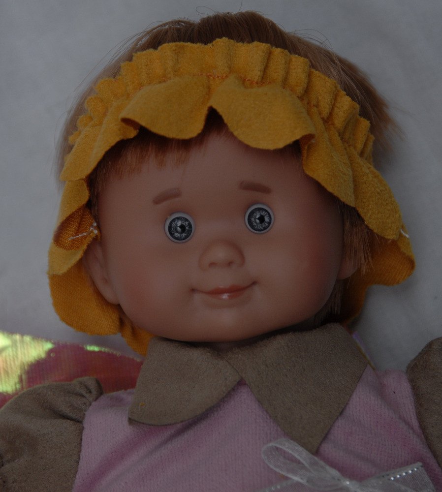 Skřítek Oranžová čelenka je panenka značky Magic Baby, která byla vyrobena ve Španělsku firmou Lamagik. Panenka je vysoká 28 cm. Tělíčko je látkové a hlavička a končetiny jsou z vinylu, na místě kloubů je prošití,aby panenka mohla hýbat ručkama a nožkama. Dolní část tělíčka je vyplněna sypkou hmotou a slouží jako těžítko, skřítek sám sedí. Má modré nemrkací oči a krátké zrzavé vlásky, našité po c...