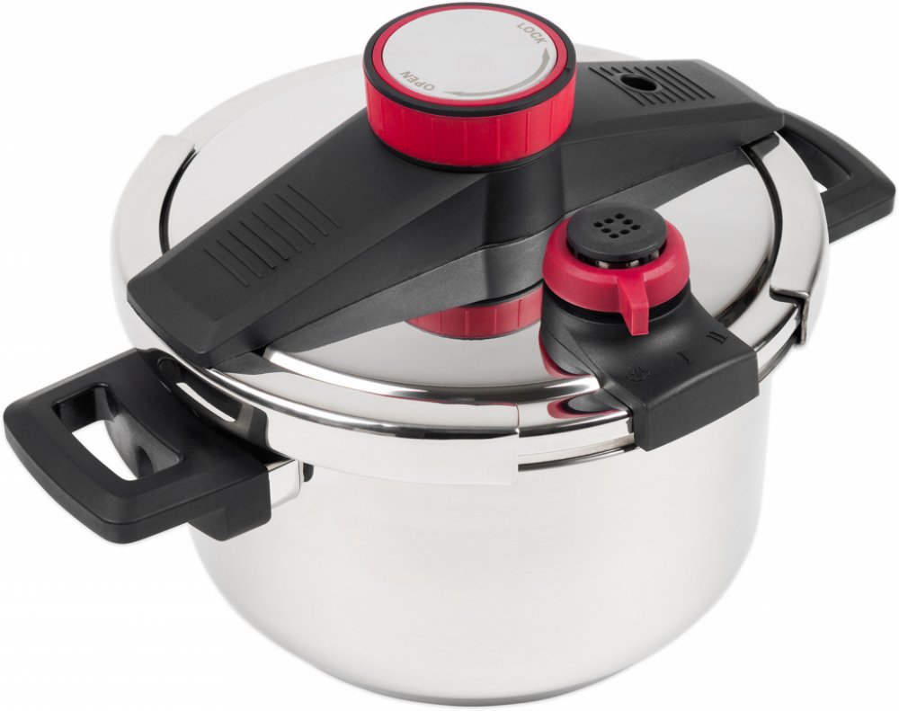 Tlakový hrnec je vybaven indikátorem tlaku, dvojím bezpečnostním ventilem a bezpečnostním okénkem, pojistkou proti přetlaku a masivními držadly pro snadnou manipulaci, která nepálí.