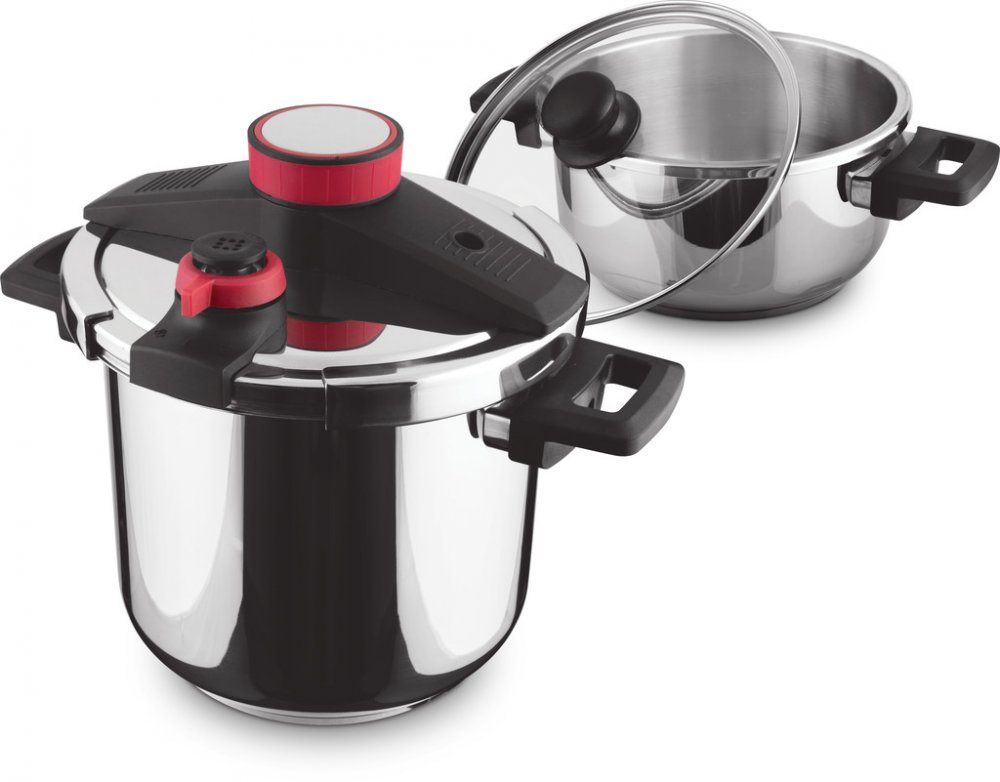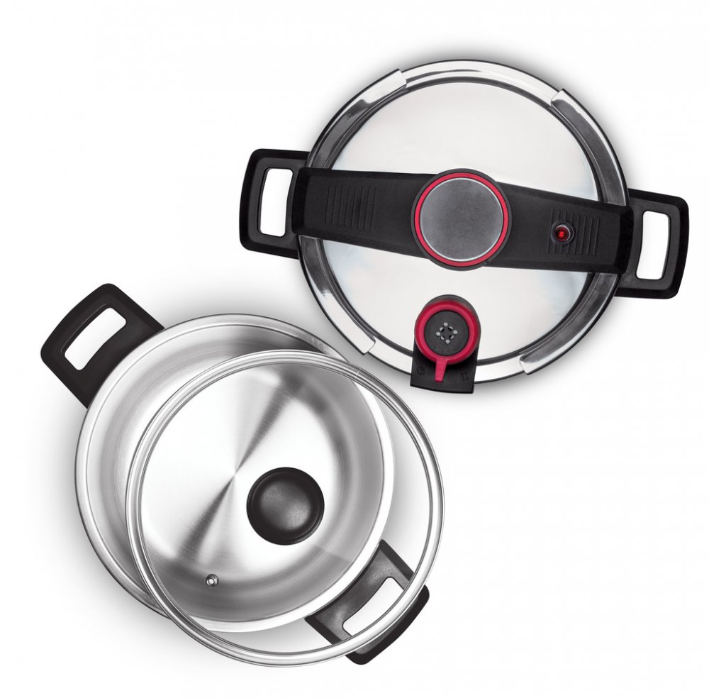 Tlakový hrnec je vybaven indikátorem tlaku, dvojím bezpečnostním ventilem a bezpečnostním okénkem, pojistkou proti přetlaku a masivními držadly pro snadnou manipulaci, která nepálí.