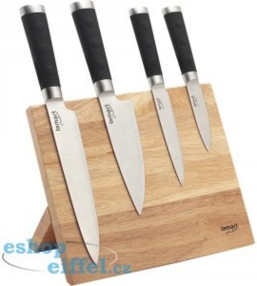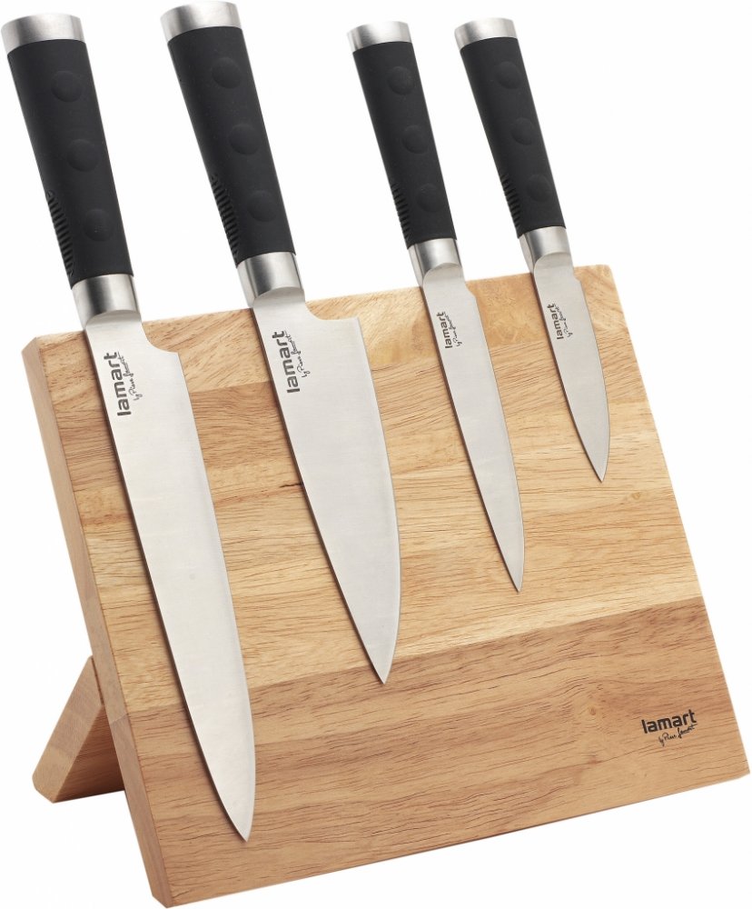 Sada 4 nerezových nožů na magnetickém stojanu řady Blade od značky Lamart se pyšní kvalitním ostřím a ergonomickou rukojetí pro maximální účinek a bezpečné užití. Nože neovlivňují vůni a chuť krájených potravin. Po použití omyjte a osušte, jsou vhodné i do myčky nádobí. Součástí sady je i skládací dřevěný blok s magnetickým vnitřkem.