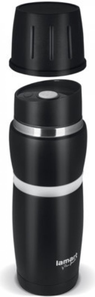 Kvalitní termoska s víčkem z nerezavějící oceli značky Lamart. Elegantní černé provedení s bílým protiskluzovým páskem. Výhodou je víčko, které slouží také jako praktický hrníček. Snadné odjištění termosky tlačítkovým mechanismem z kvalitního plastu. Termoska Cup má pojistkový mechanismus, jež zabraňuje nečekanému otevření. Díky nerezové vložce je termoska téměř nerozbitná. Termoska udrží Váš náp...