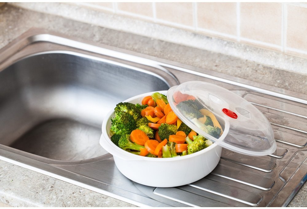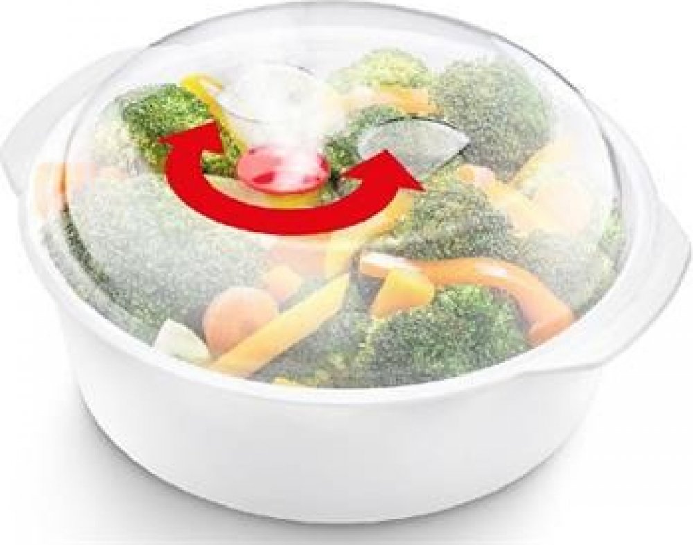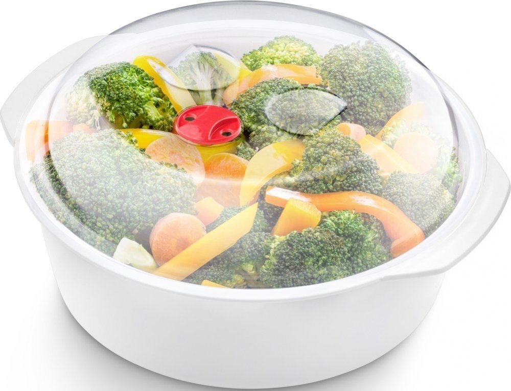 Multifunkční odolná plastová nádoba určena také pro ohřev v mikrovlnné troubě, součástí nádoby je těsnící víko s parním průduchem a parní mřížka.