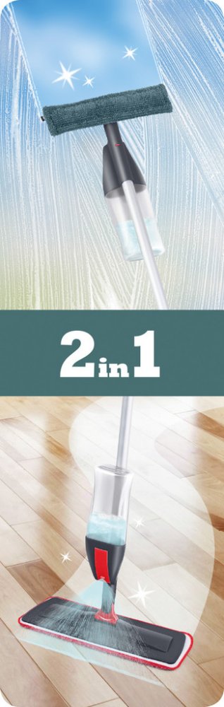 Plochý mop se sprejovou nádržkou a výměnnou dvojitou stěrkou.