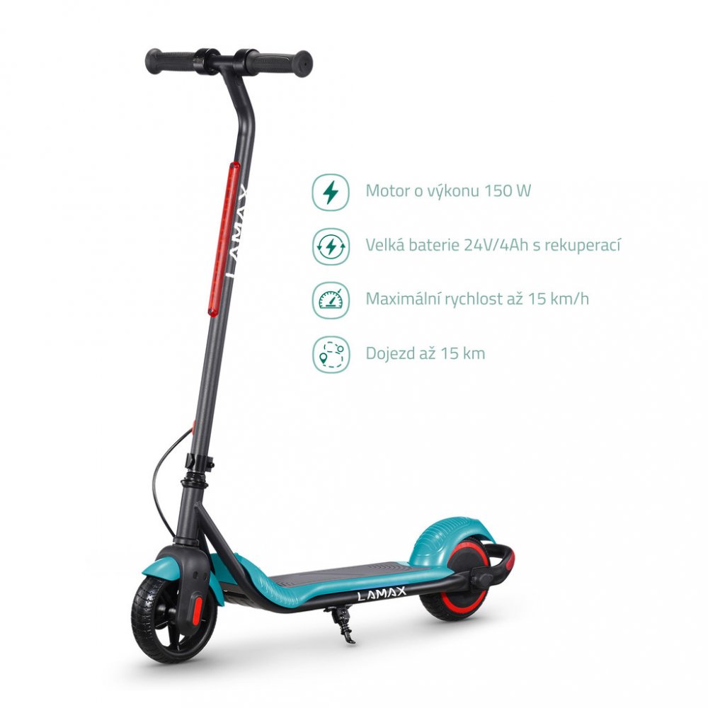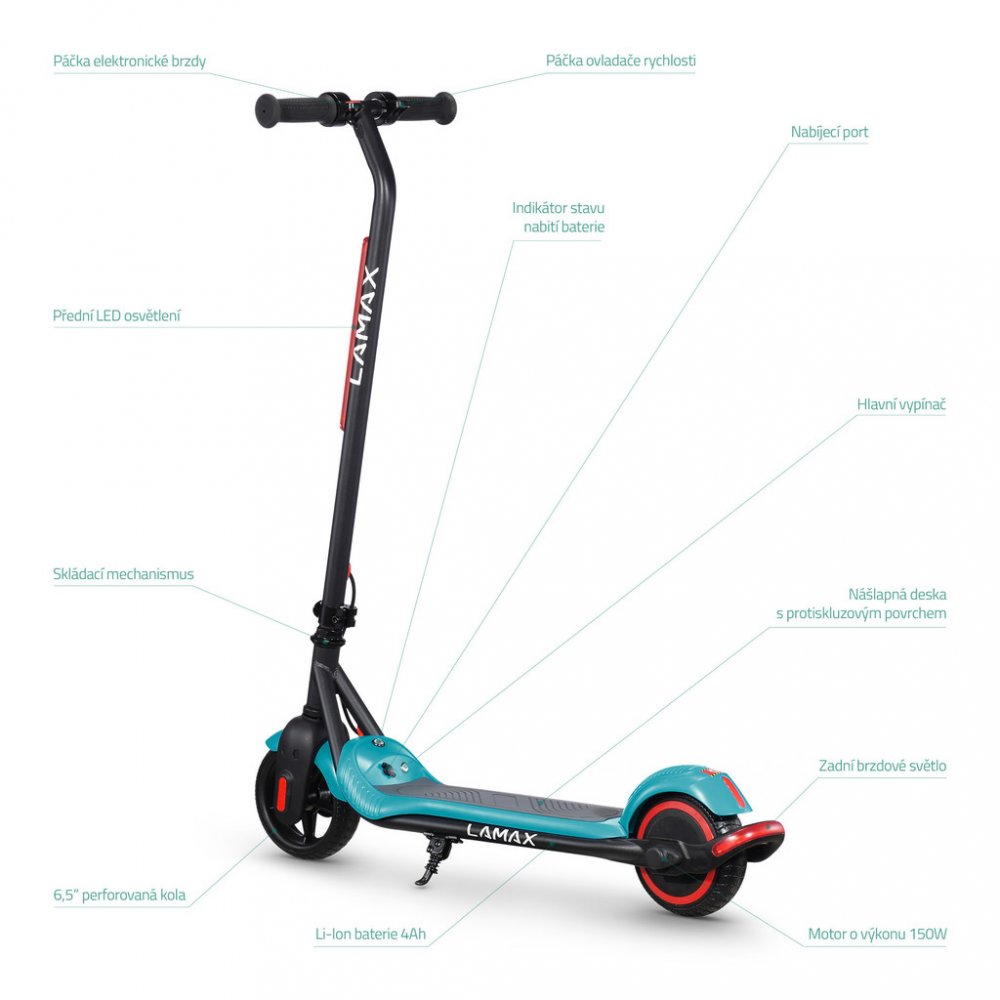 Lamax 150 W 7 kg 60 kg 15 km/h 15 km pro děti pro krátké cesty po městě (do 25 km) třída jízdní kolo 4000 mAh pro snadné přenášení (do 13 kg) pro rovné cesty a chodníky 165 mm plné elektronické pro menší zásilky