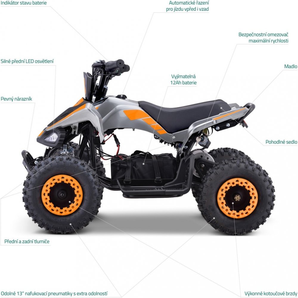 800 W je pro menší děti pořádná porce výkonu, takže překážky, terén ani kopce nejsou problém. Motor je tichý a nevyrábí žádný emise – prostě parťák do dnešní doby. O šťávu se stará 12Ah baterka s dlouhou výdrží. Maximální váha jezdce je 65 kg.