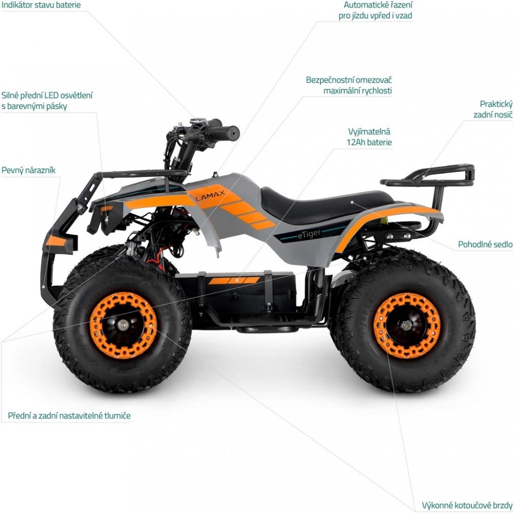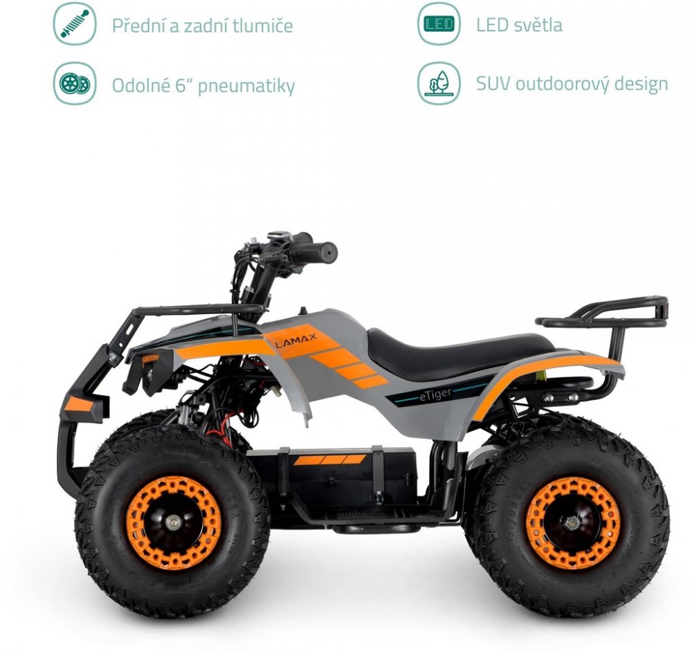 Elektrická čtyřkolka Lamax eTiger zajistí spoustu zábavy každému malému závodníkovi. Díky motoru s výkonem až 1 000 W se může až 1,5 hodiny prohánět na zahradě nebo v přírodě. Motor je kartáčový a na jedno nabití ujede až 20 km.