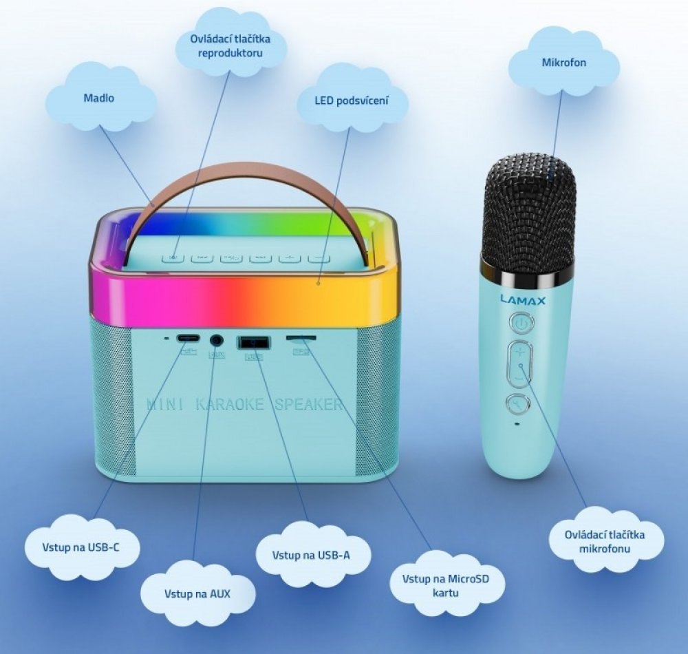 Děti se nebojí jít do všeho naplno, třeba i rozjet pořádnou hudební show. Zdatně jim při tom bude asistovat reproduktor LAMAX KaraokeKid1 v cool modrém nebo růžovém dětském designu, u kterého nechybí ani stejně vychytaný karaoke mikrofon. Reprák jde samozřejmě využít i pro poslech pohádek nebo hudby...